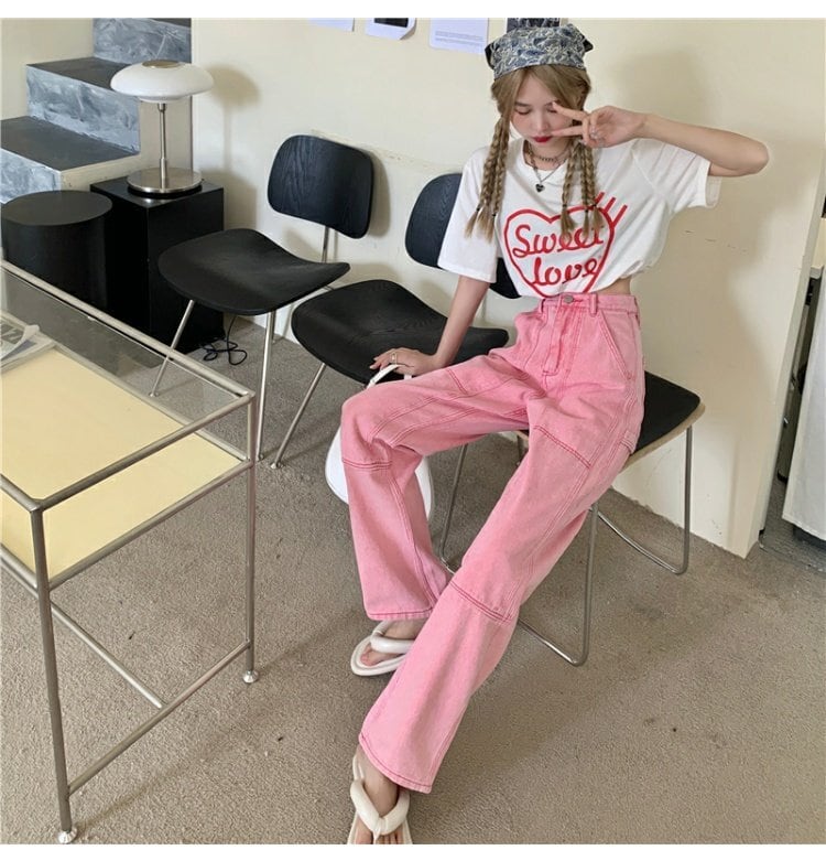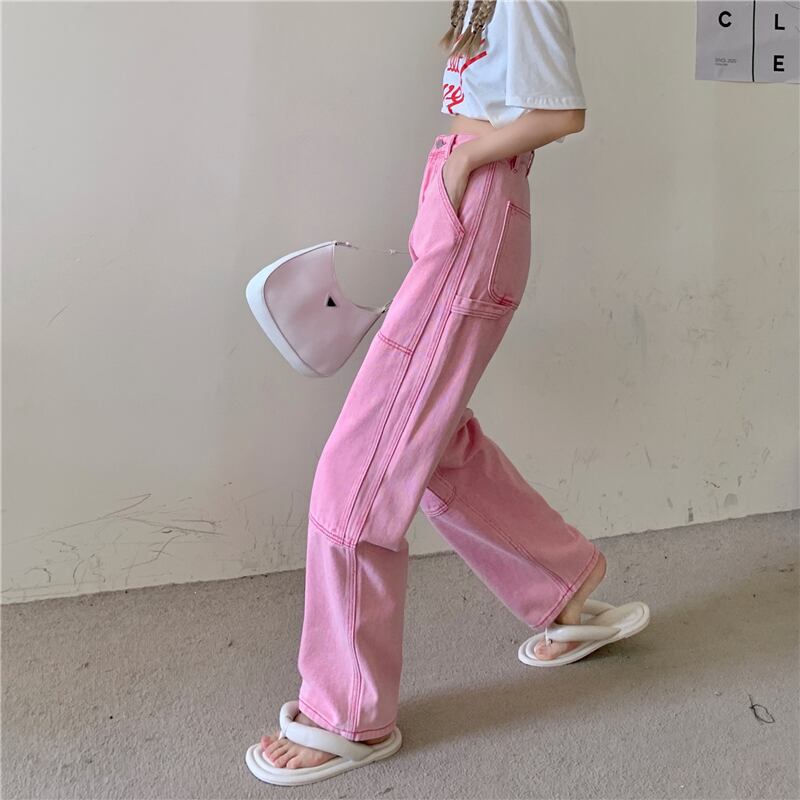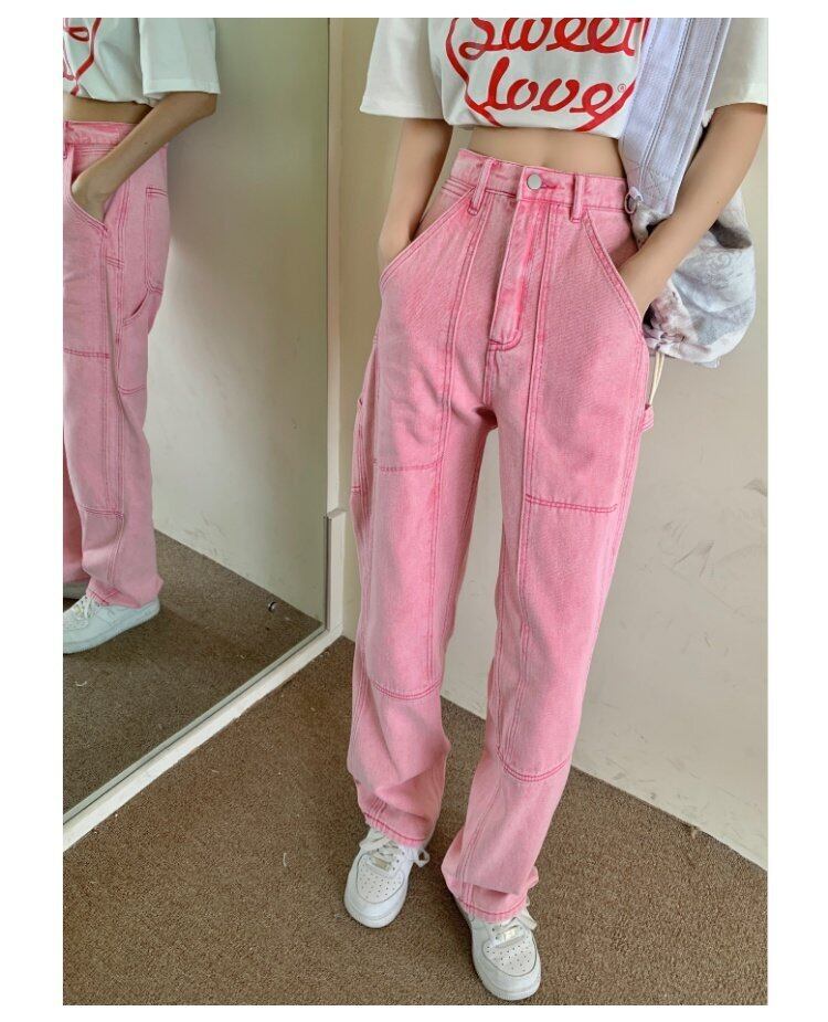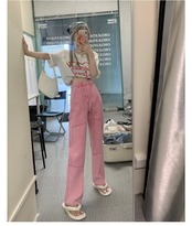 ハイウェストウェストジーンズ レディース夏服韓国ファッションスタイルワイドレッグパンツ トレンド ピンク 大人ガーリー スウィート キュート カジュアル 夏物 ワイドパンツ ウエスト コーデ marchs6789183302694