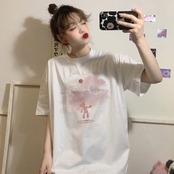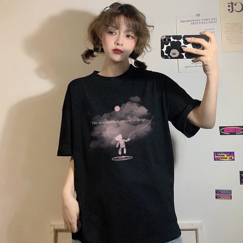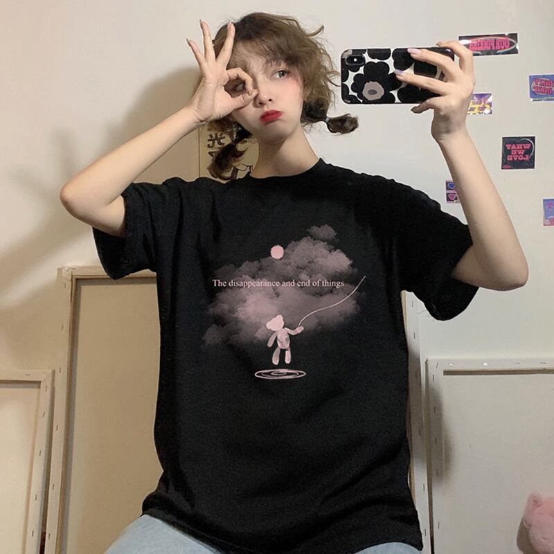 スプリング夏服スタイルダークプリント柄ブラックTシャツルーズトップス 原宿 春物 夏物 コーデ marchs6735383045037