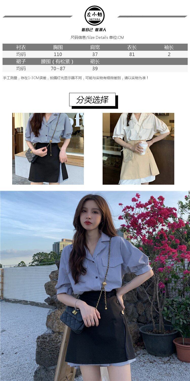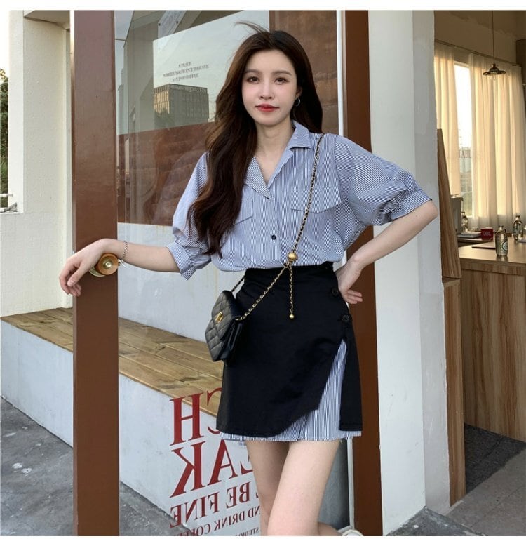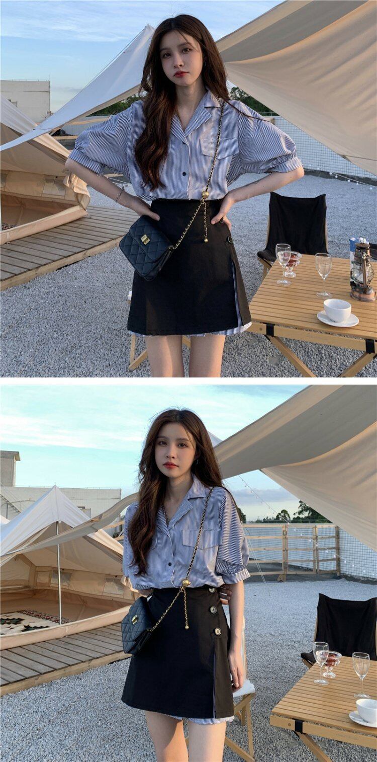 色:ブラックストライプシャツドレス,カーキ色のスカート,黒スカート,アプリコットストライプシャツドレス