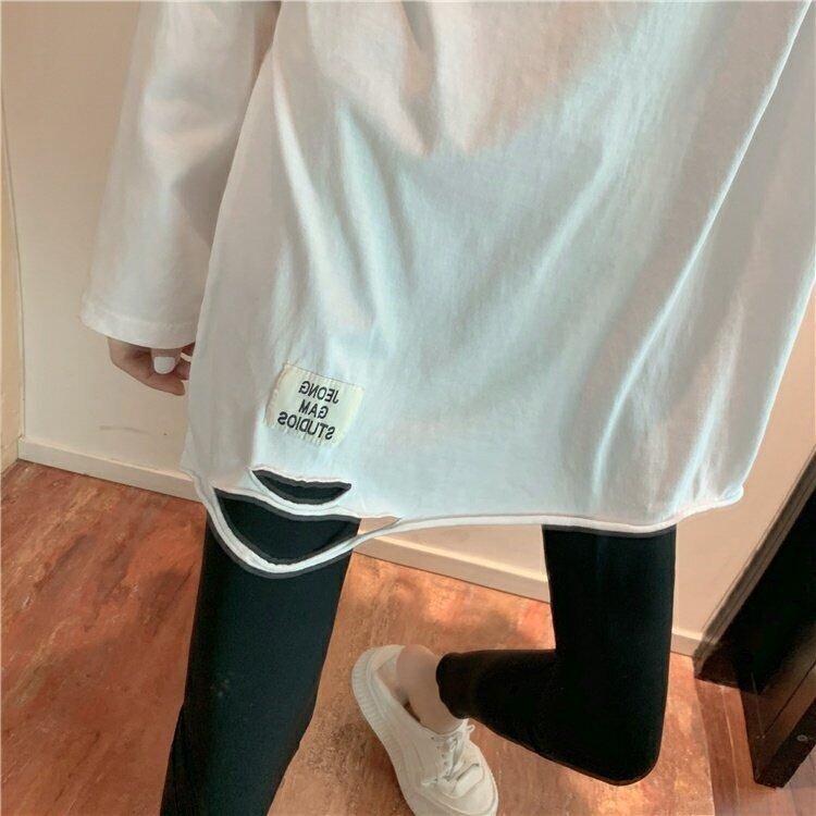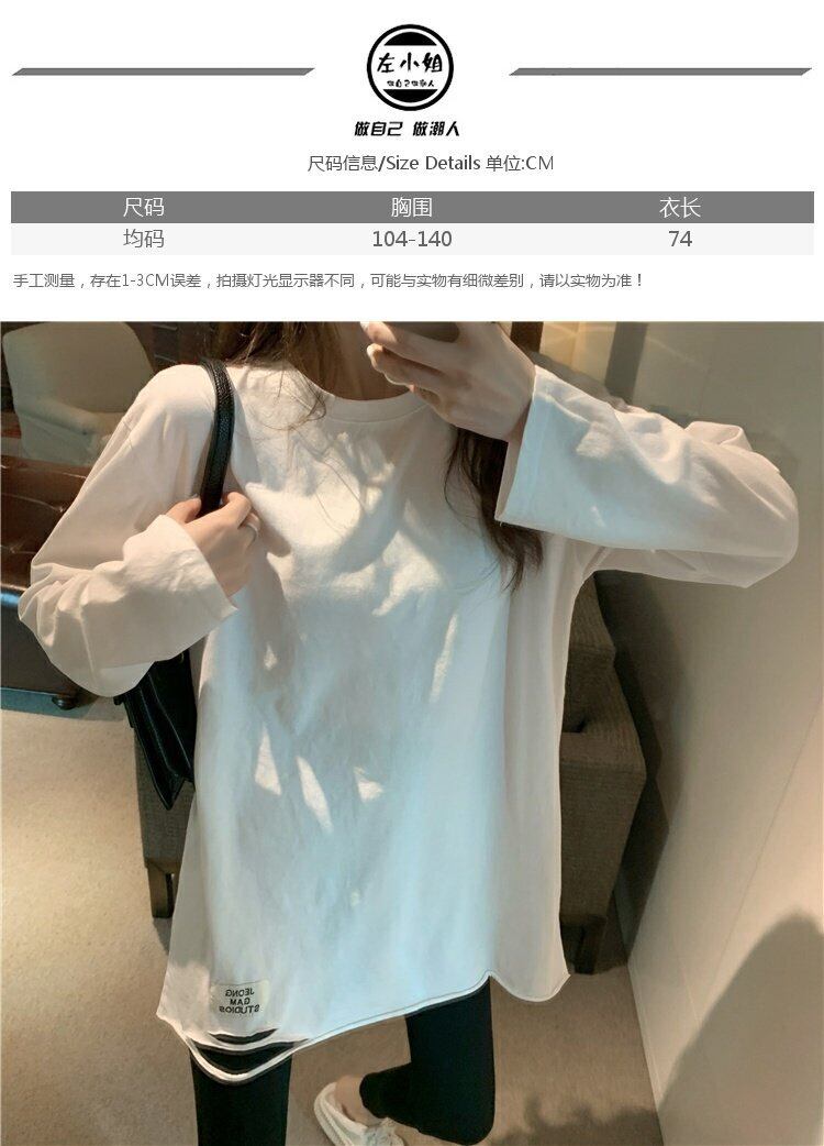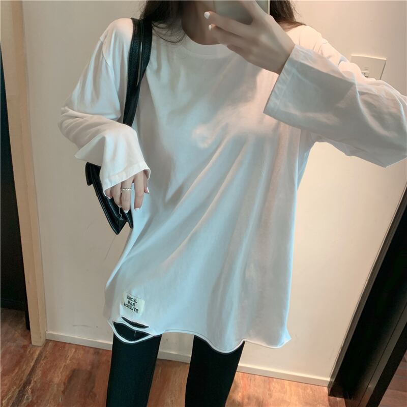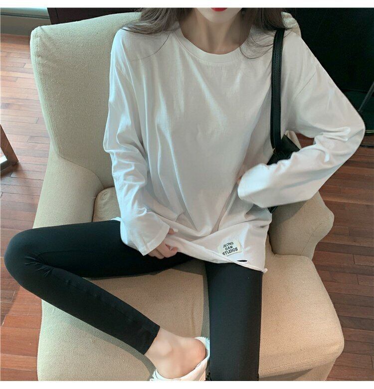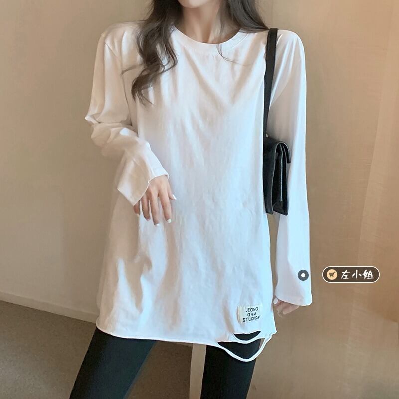 スプリング秋物韓国ファッションルーズトップス ラウンドネック厚みゆったりシャツ ホワイトTシャツレディース ロング 春物 オータム Oネック 長袖 ミドル丈 コーデ marchs6740734193151
