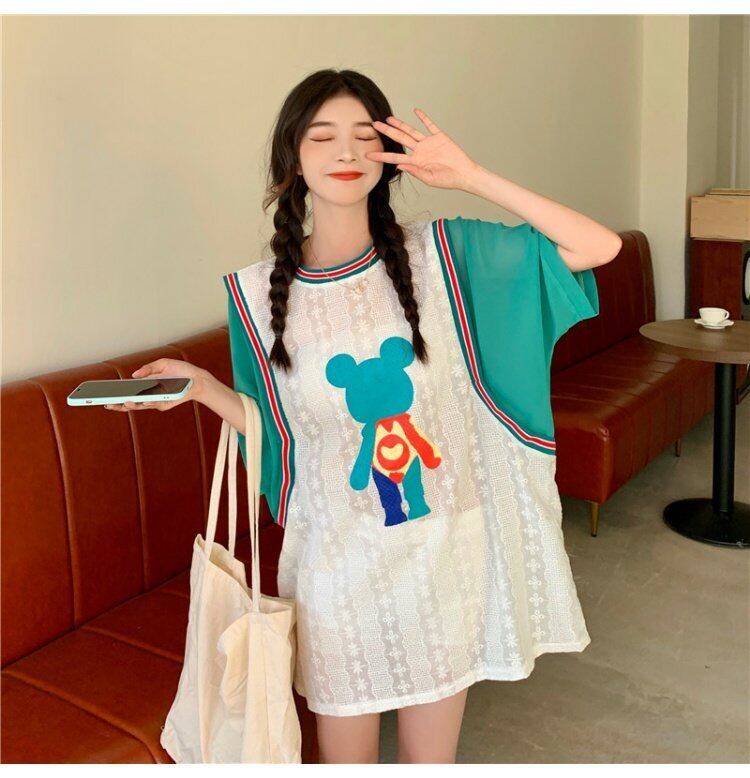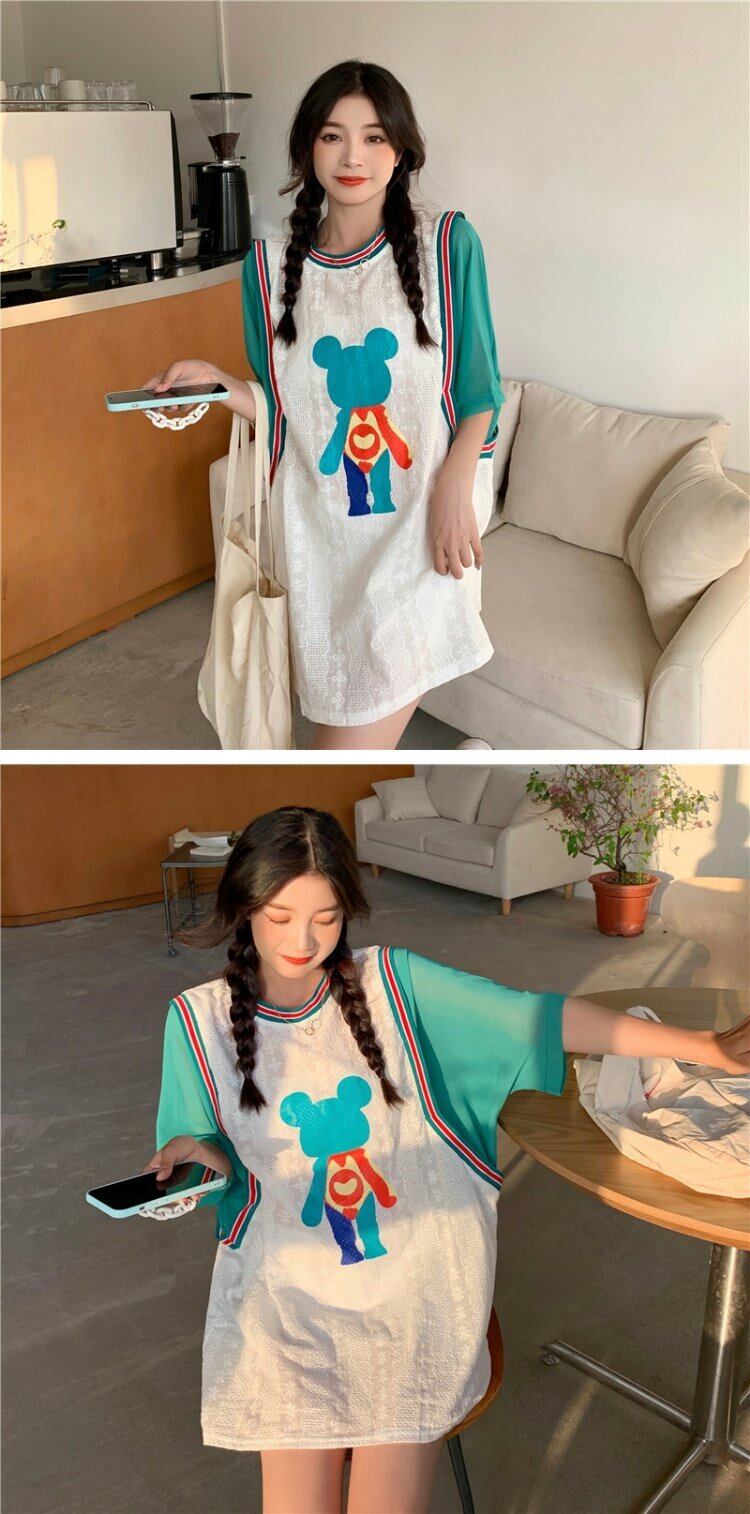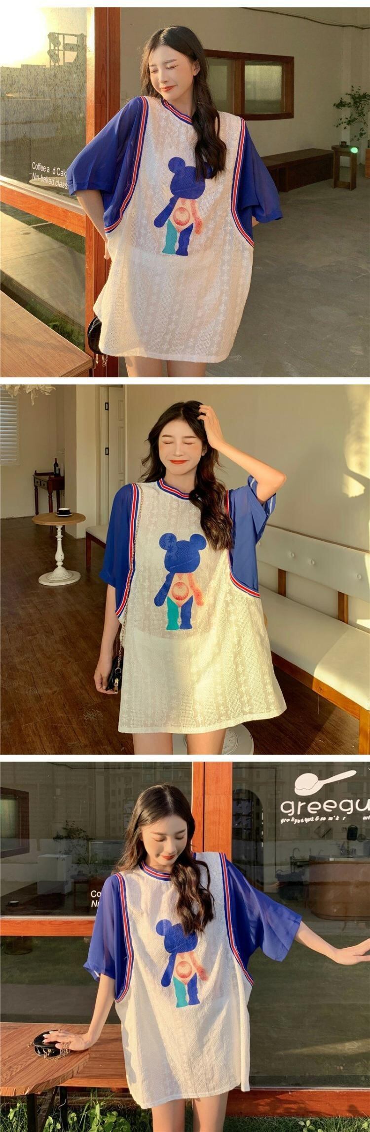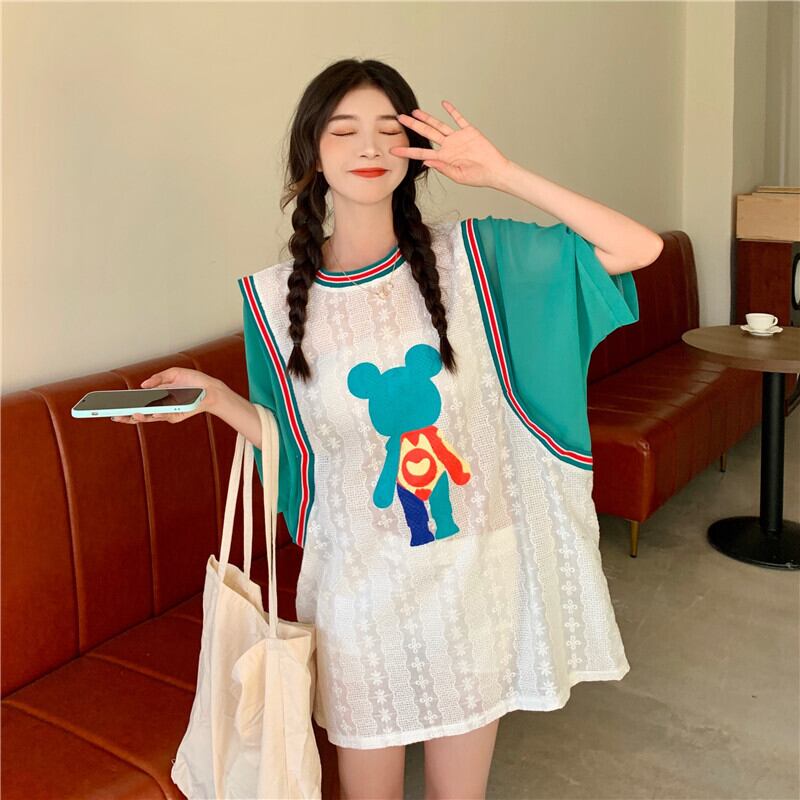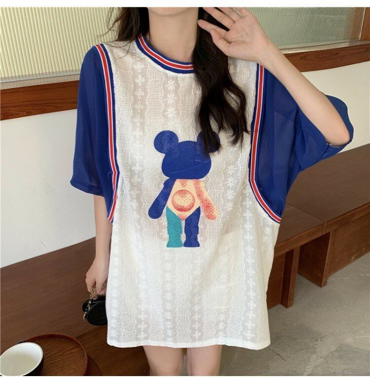 Tシャツレディース夏服プリント柄ブルーロングルーズトップス 夏物 シルク ステッチ コーデ marchs6712317110868