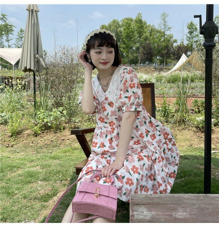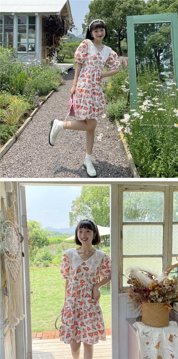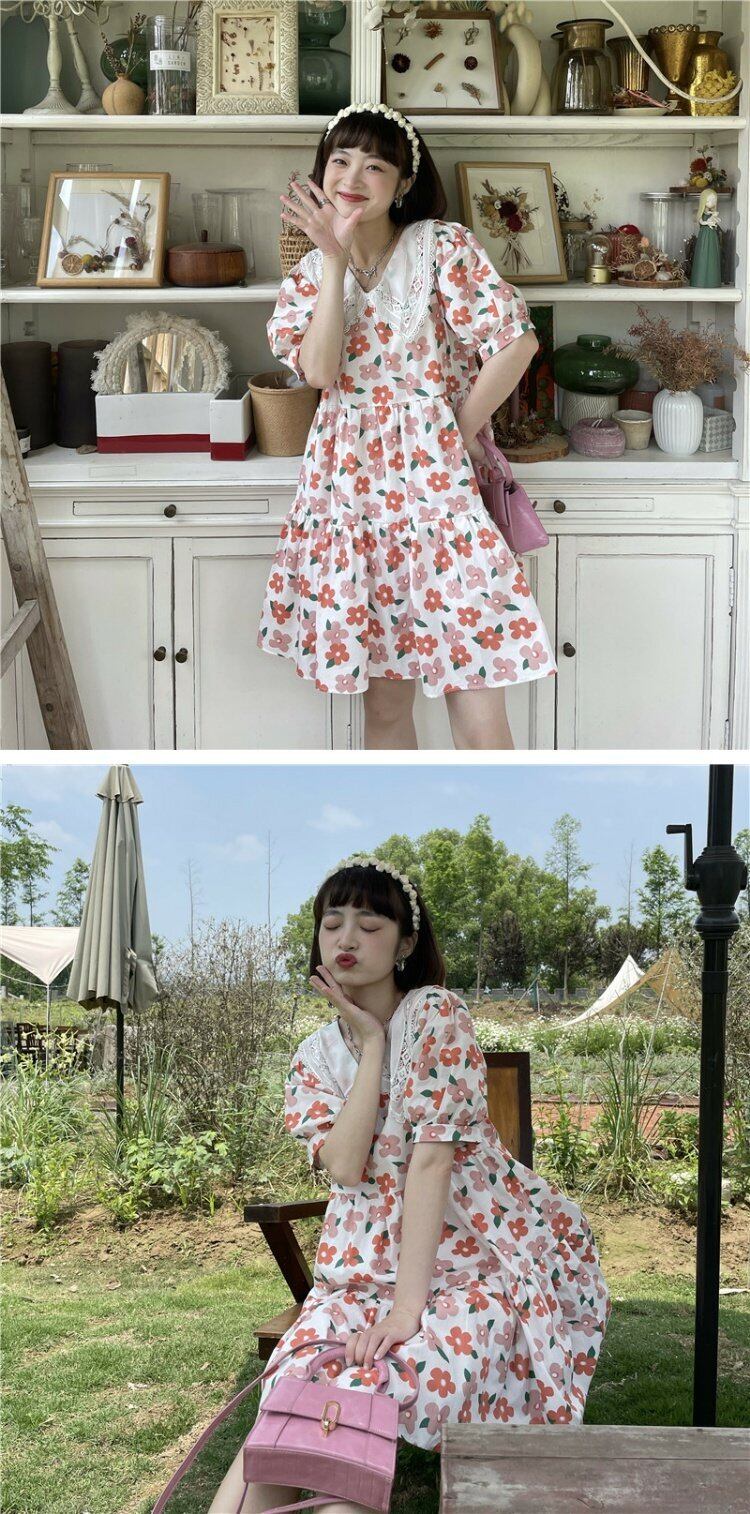 フローラルVネックワンピース夏服カラースリーブAラインスカート 大人ガーリー スウィート キュート カジュアル 夏物 花柄 コーデ marchs6799839105791
