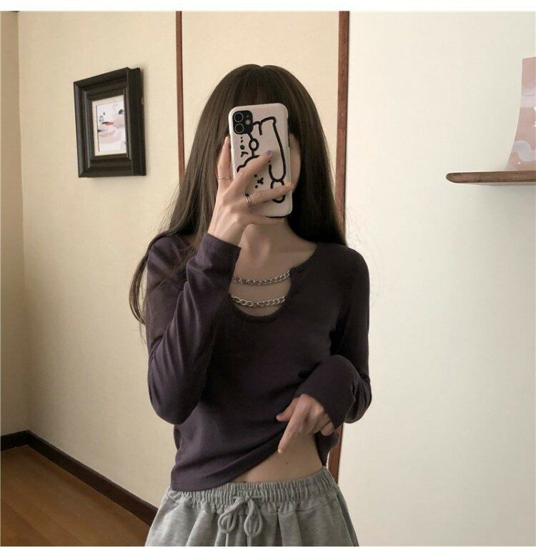 ゆったりシャツ トップス スプリング秋物チェーン ブラックTシャツ ロング 春物 オータム 長袖 コーデ marchs6773554620257