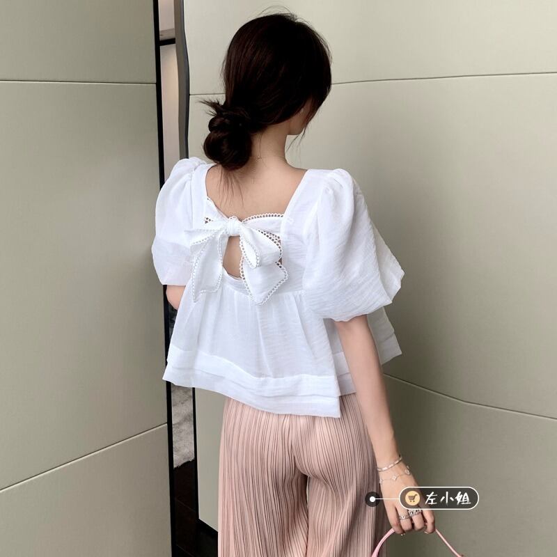 リボンホルターパフスリーブスリーブトップス レディース夏服ショートホワイトシャツ 大人ガーリー スウィート キュート カジュアル 夏物 コーデ marchs6790088254969