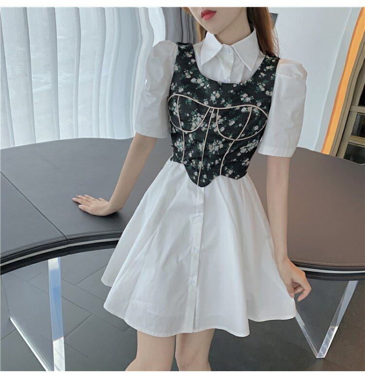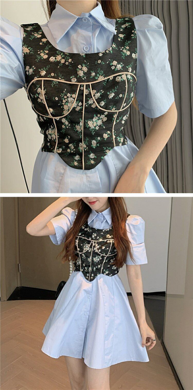 色:ベスト,白いドレス,青い服