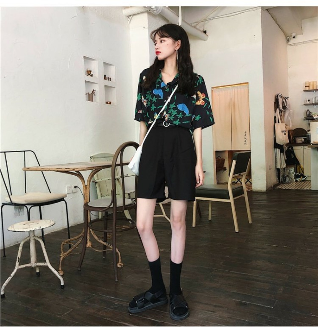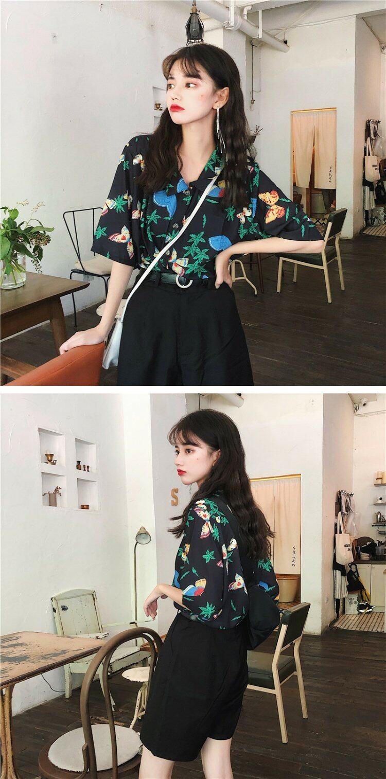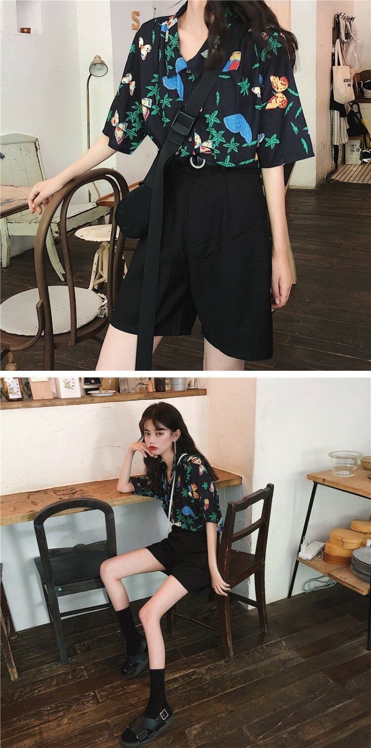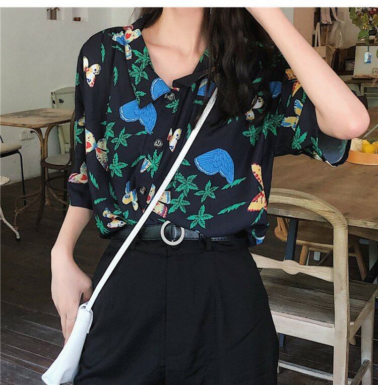 夏服スタンダードスタイルプリントシャツ スリムショーツ レディース レトロ 夏物 コーデ marchs6755825372854