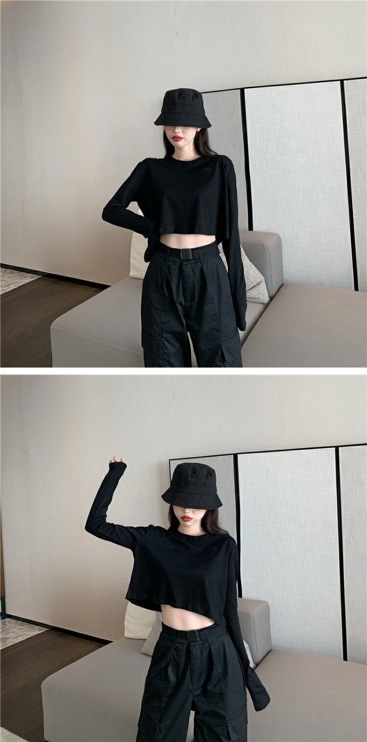 ショートトップス スプリング秋物ルーズブラックハイウェストウェストクロップドスタイル長袖スリーブTシャツトレンド ロング 春物 オータム ウエスト コーデ marchs6759360194193