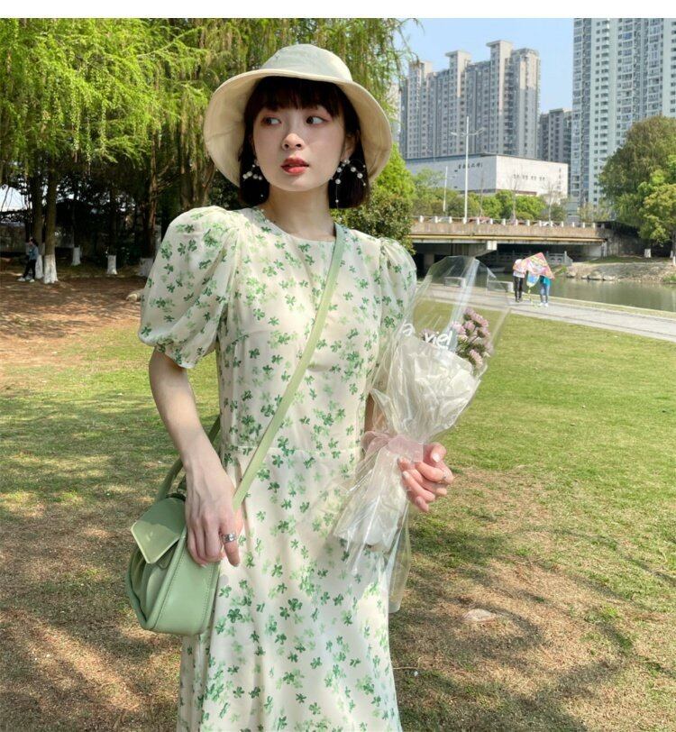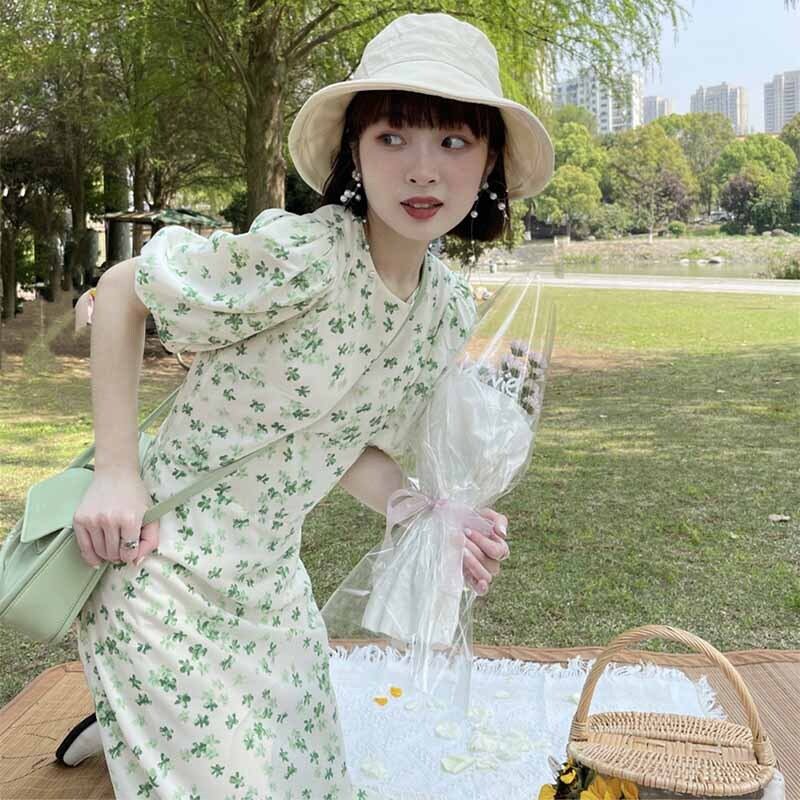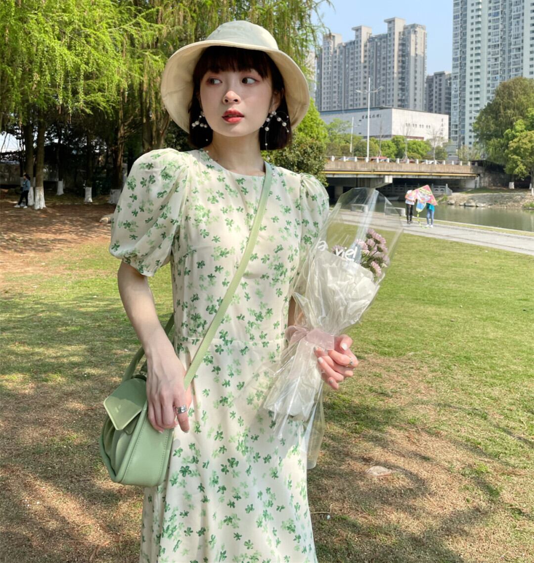 フローラルスリーブワンピースレディース夏服韓国ファッションスタイルウェストスカート 夏物 花柄 ウエスト ミドル丈 コーデ marchs6737013061703