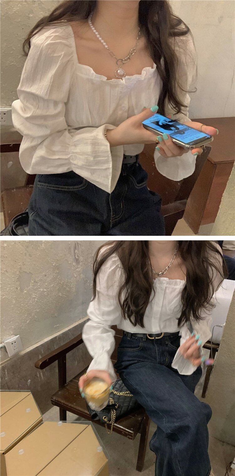 スプリング韓国ファッションスタイルルーズ薄手シャツ カラーホワイトレディース ロング 春物 スクウェア 長袖 コーデ marchs6792442517698