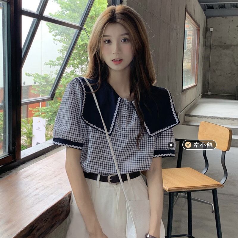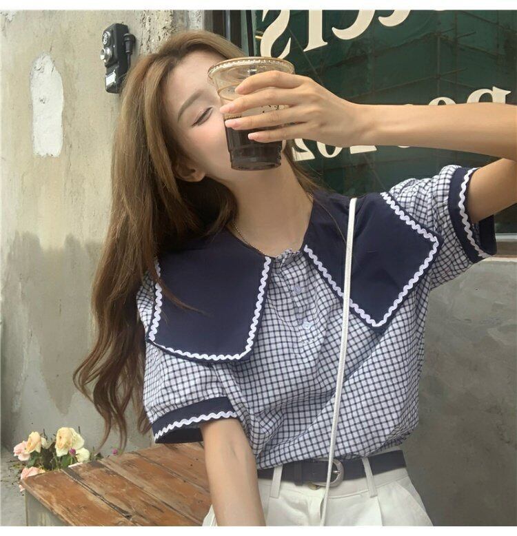 シャツ レディース夏服スタイルスタンダードネイビーカラー格子柄ブラウス レトロ 大人ガーリー スウィート キュート カジュアル 夏物 コーデ marchs6798648448302
