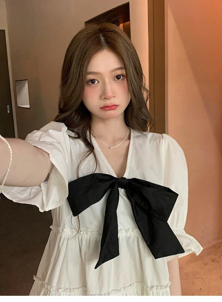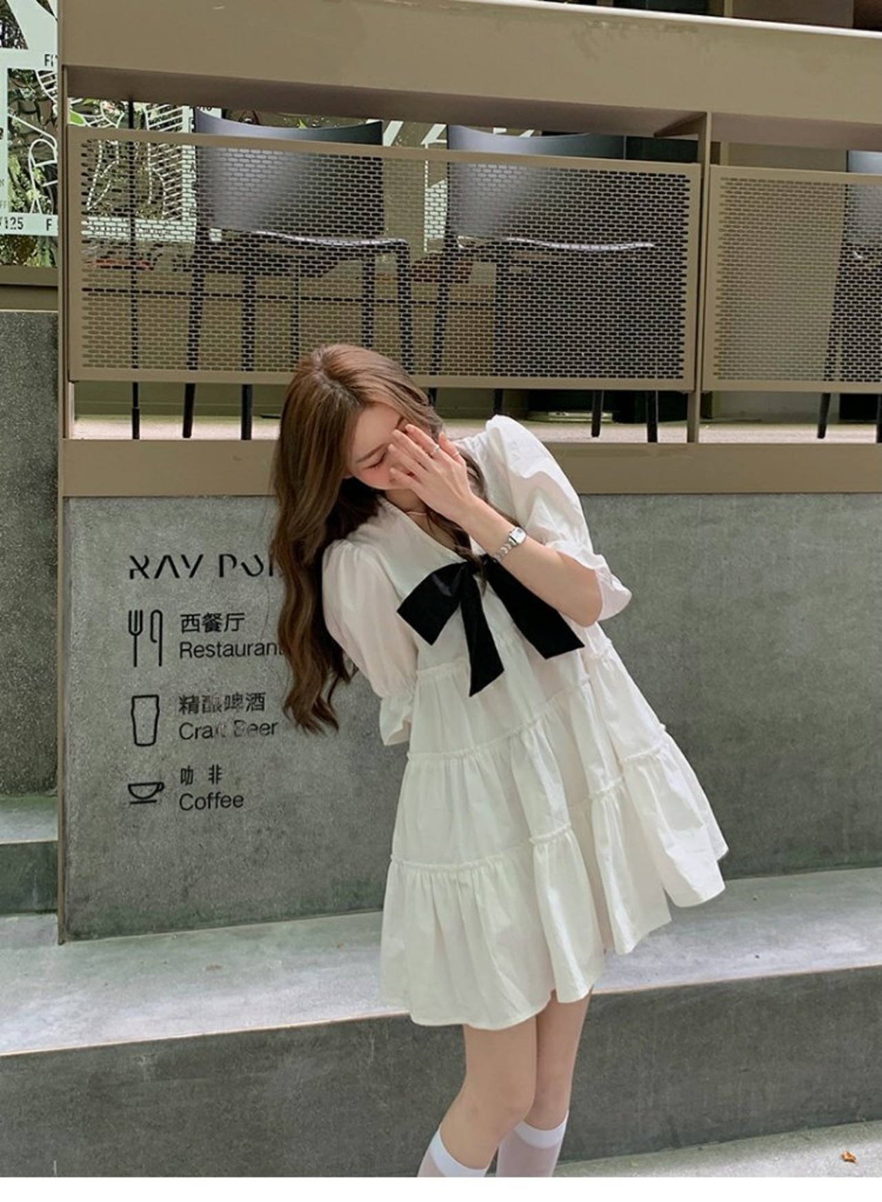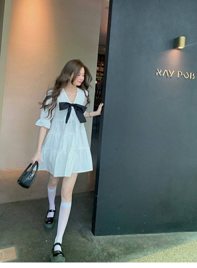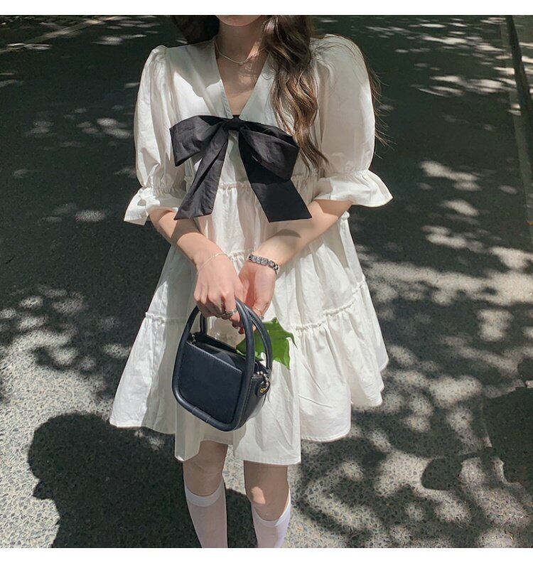 ホワイトスリーブワンピースレディース夏服リボンルーズスカート 大人ガーリー スウィート キュート カジュアル 夏物 コーデ marchs6763784072126