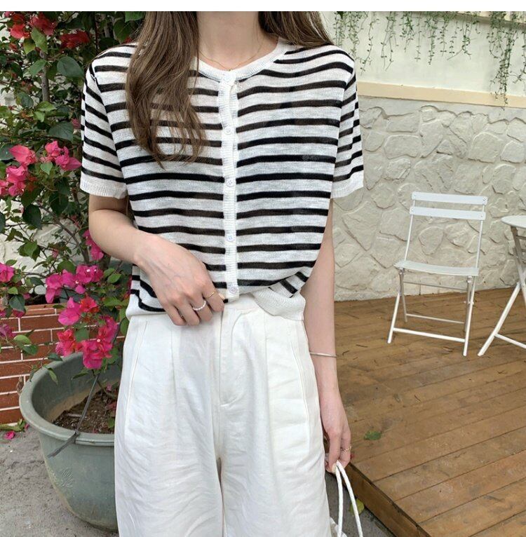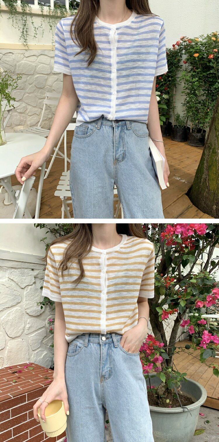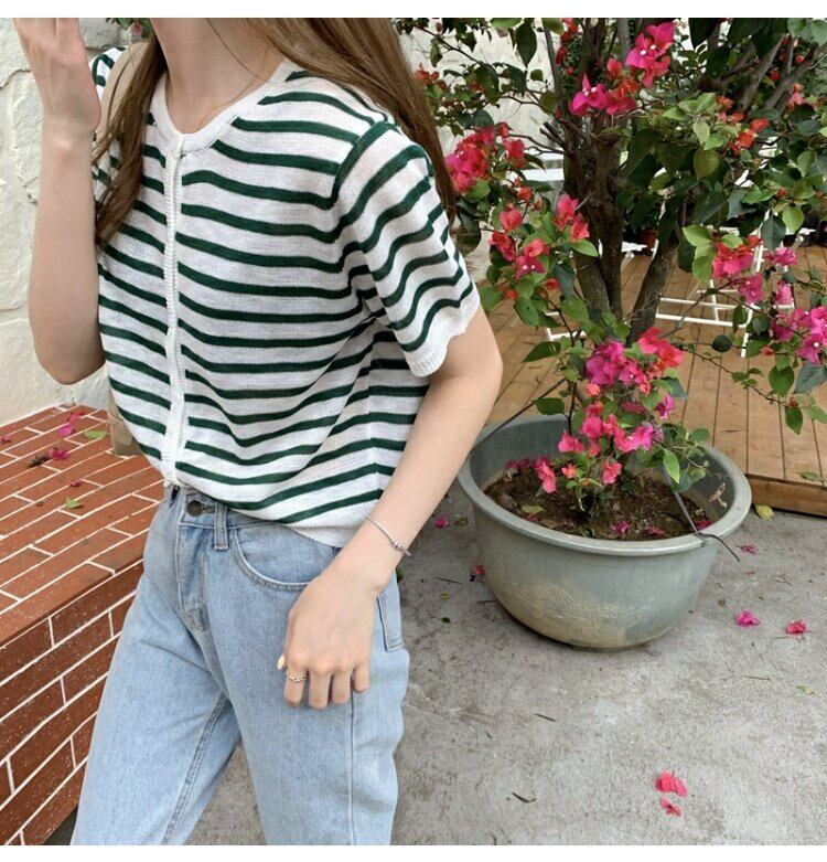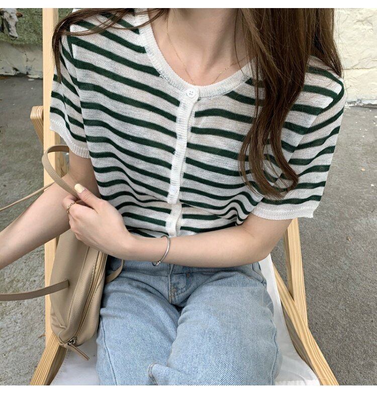 夏服ショートグリーン薄手カーディガン韓国ファッションスタンダードストライプセーター コート レディース レトロ 夏物 コーデ marchs6742849520615