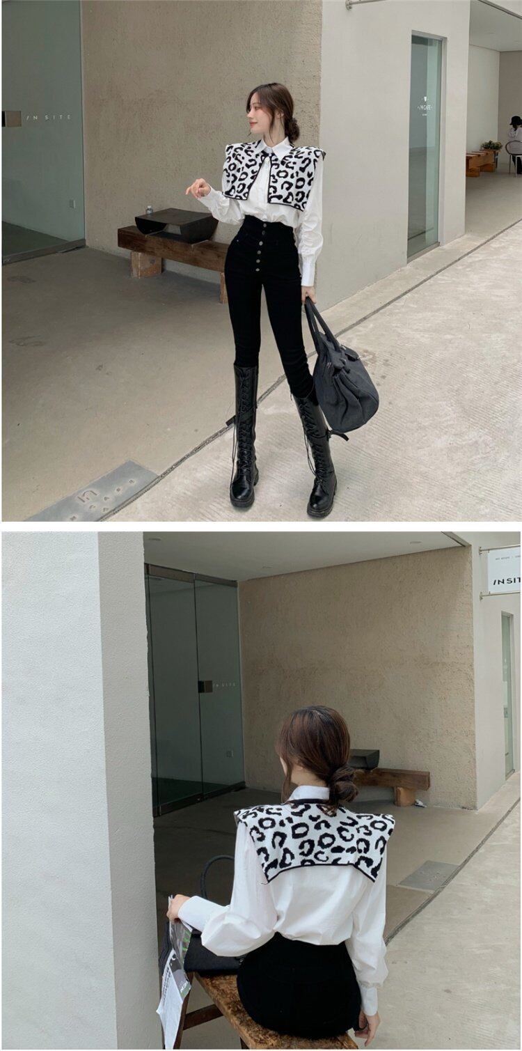 ホワイトシャツ レディースレオパードプリント柄ショールトップス スプリング秋物 ロング 春物 オータム 長袖 コーデ marchs6768742217785