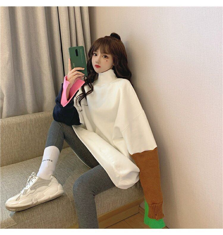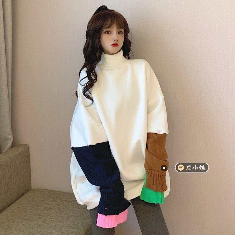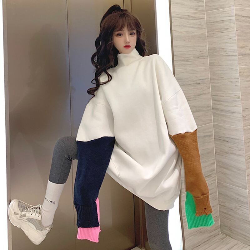 韓国ファッションルーズカラーホワイトセーター レディーストレンド ロング オータム 秋物 ウィンター 冬物 スタイル 長袖 ミドル丈 コーデ marchs6785494855565