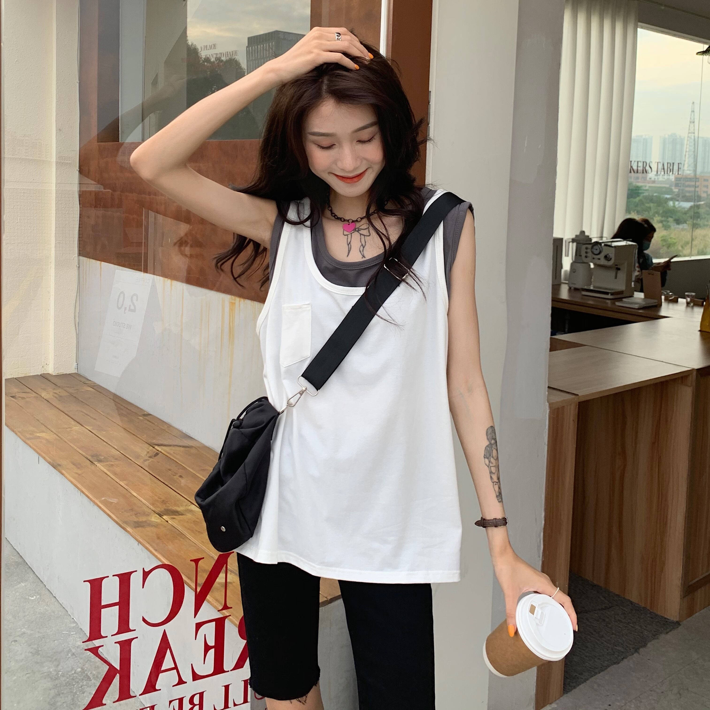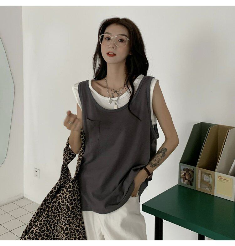 夏服ルーズツーピース ラウンドネックノースリーブTシャツトップス レディース 夏物 Oネック ステッチ コーデ marchs6746493443291