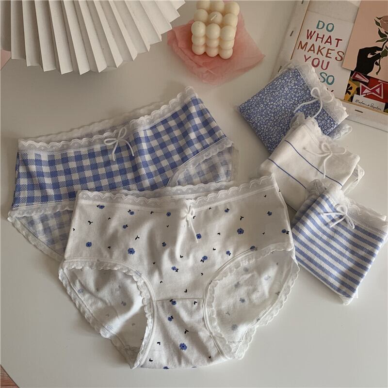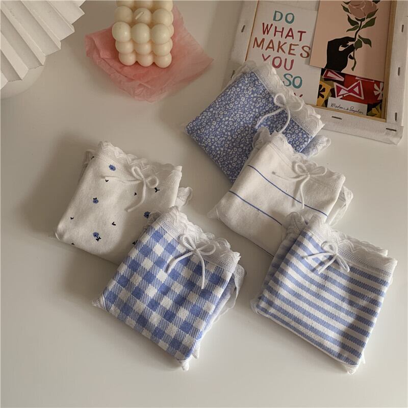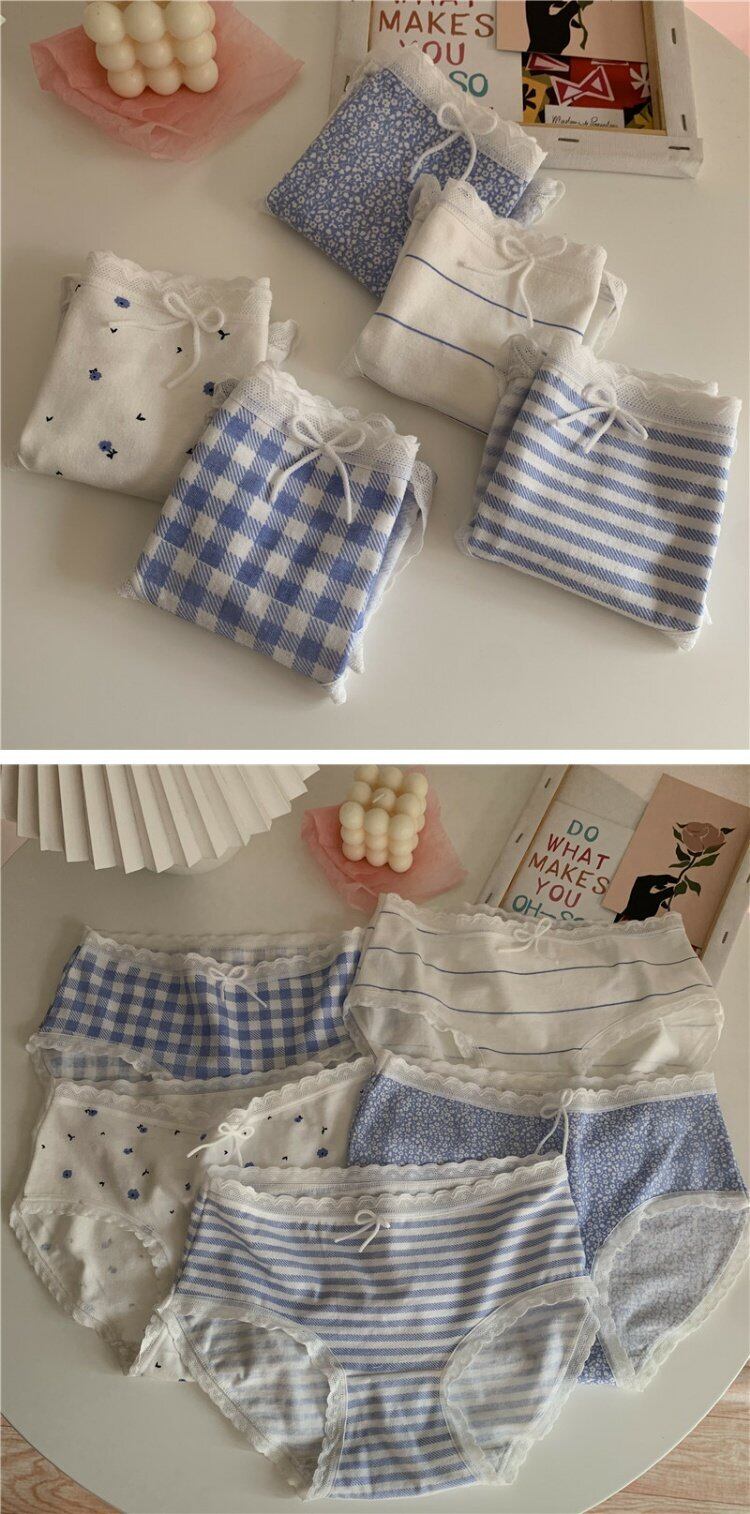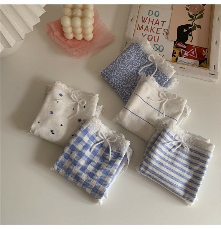 夏服ブルーレース格子柄トライアングルショーツ リボン コットン 夏物 ウエスト コーデ marchs6741015530466