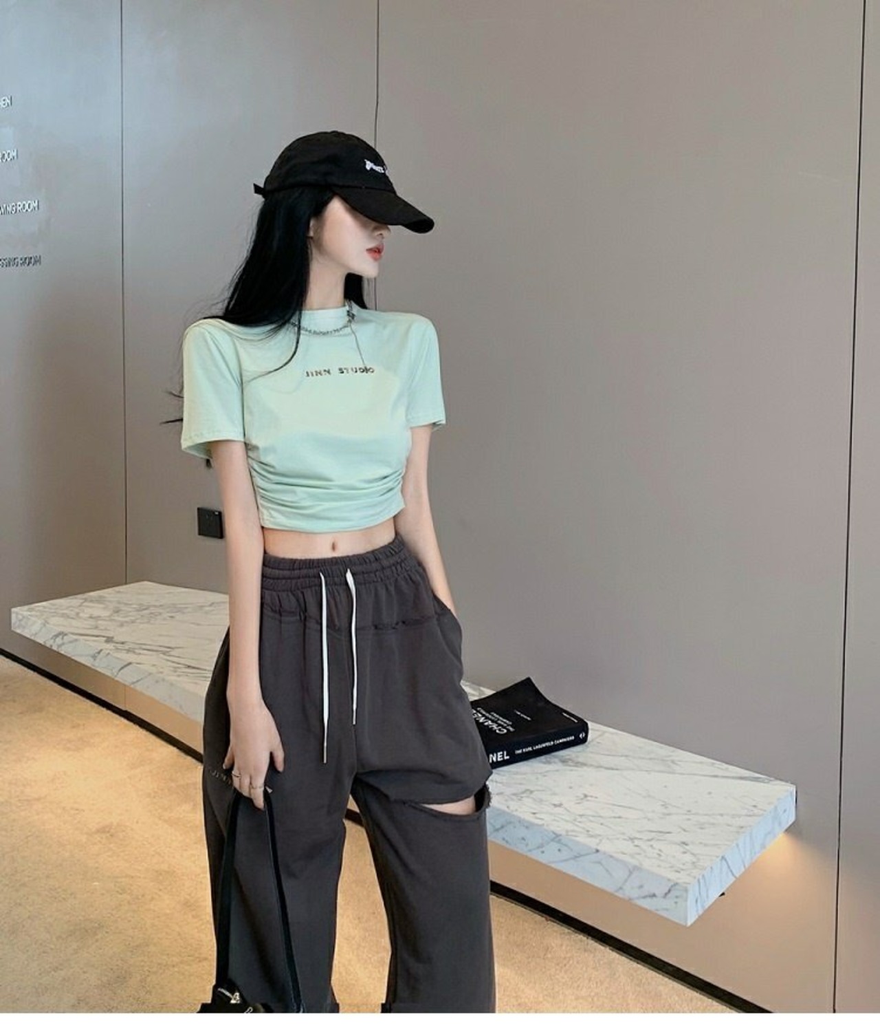 色:グリーントップ,シルバーグレーグリーンカジュアルパンツ