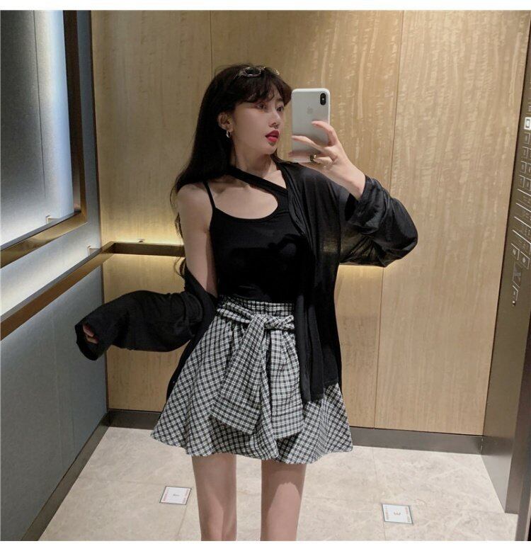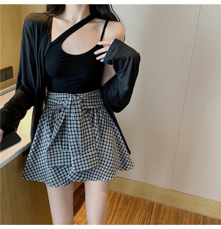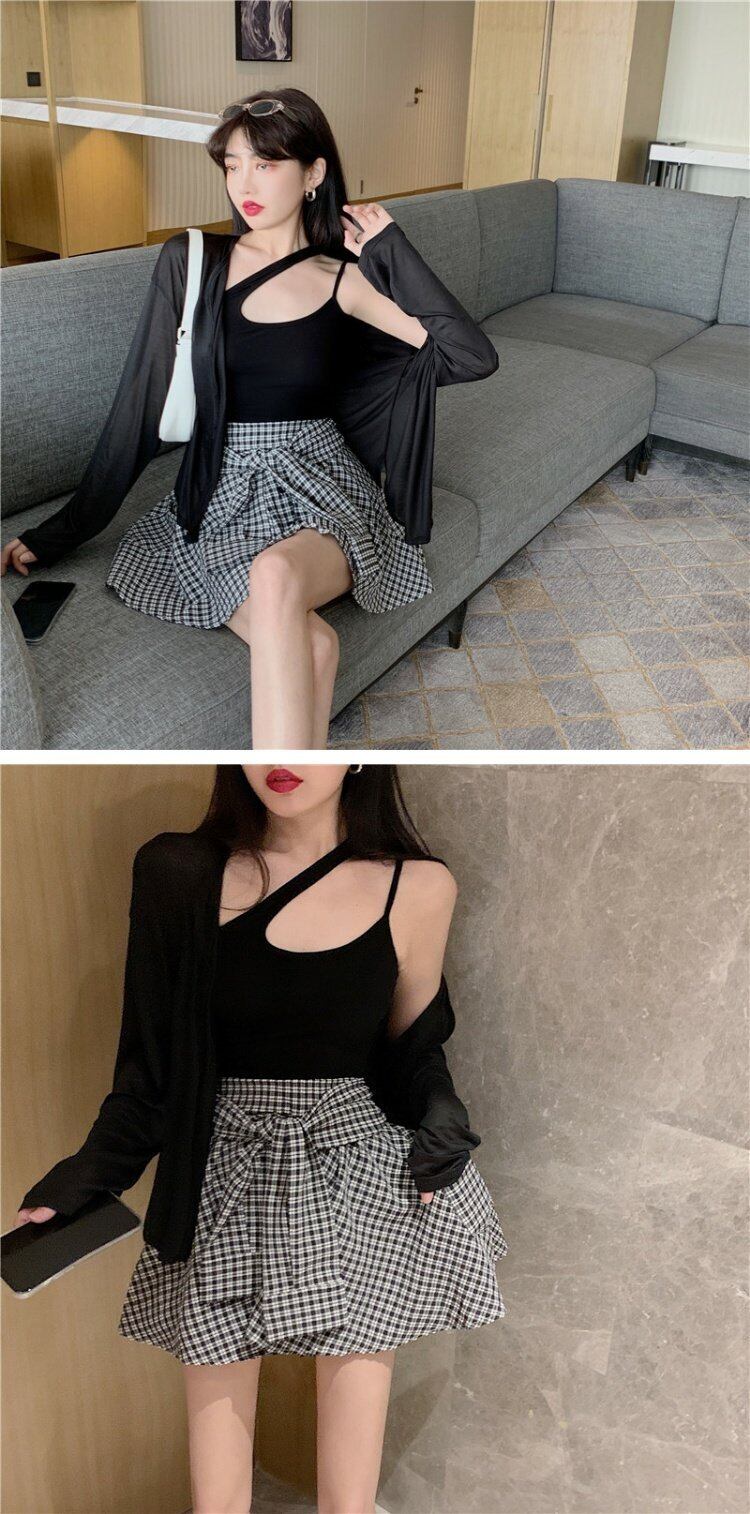 色:キャミソール,日焼け防止カーディガン,チェック柄スカート