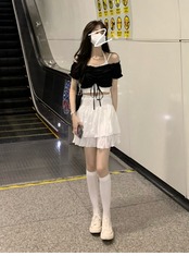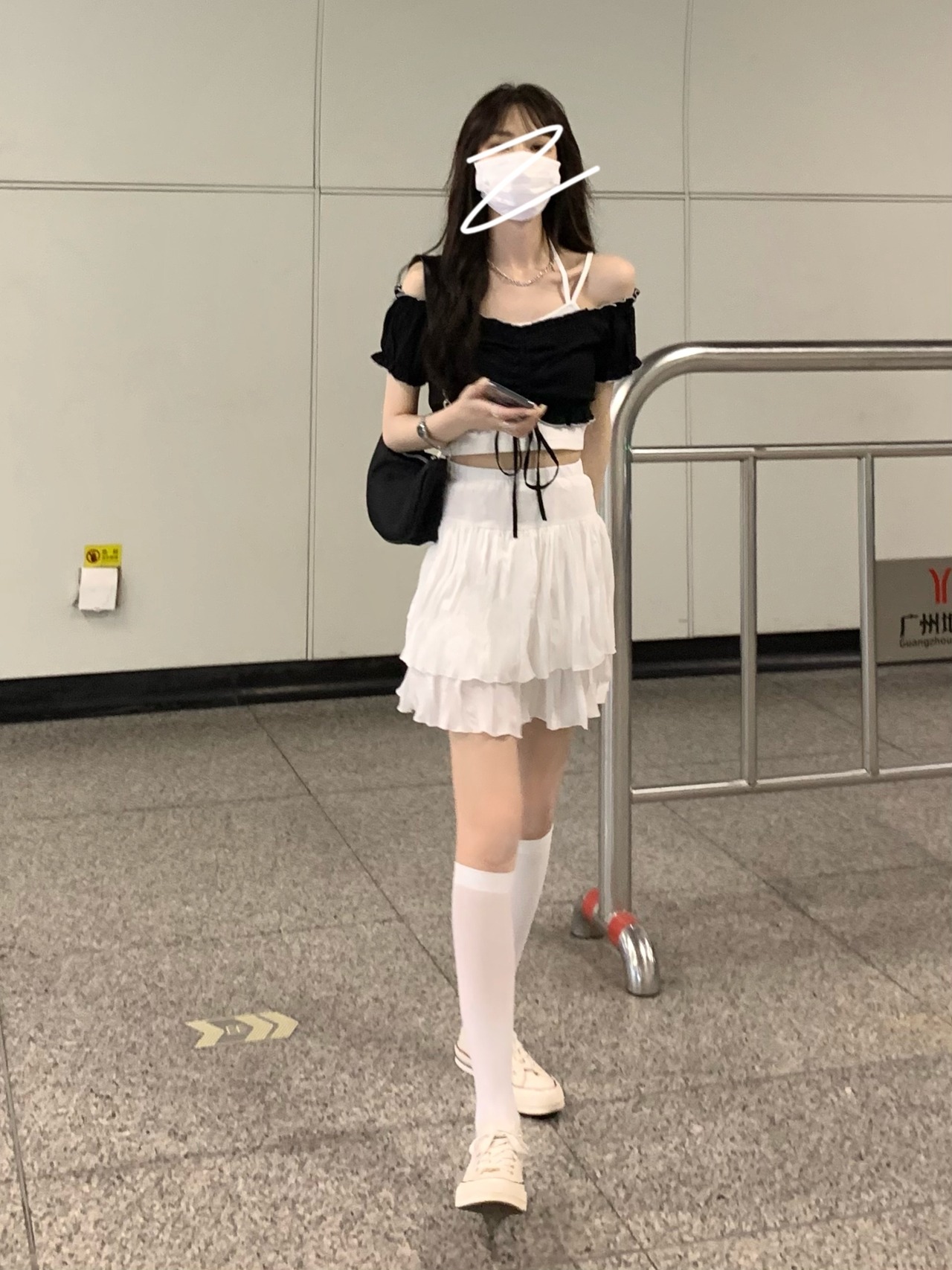 色:フラワーグレースリング,ベージュサスペンダー,黒いシャツ,ベージュの小さなシャツ,ベージュのスカート