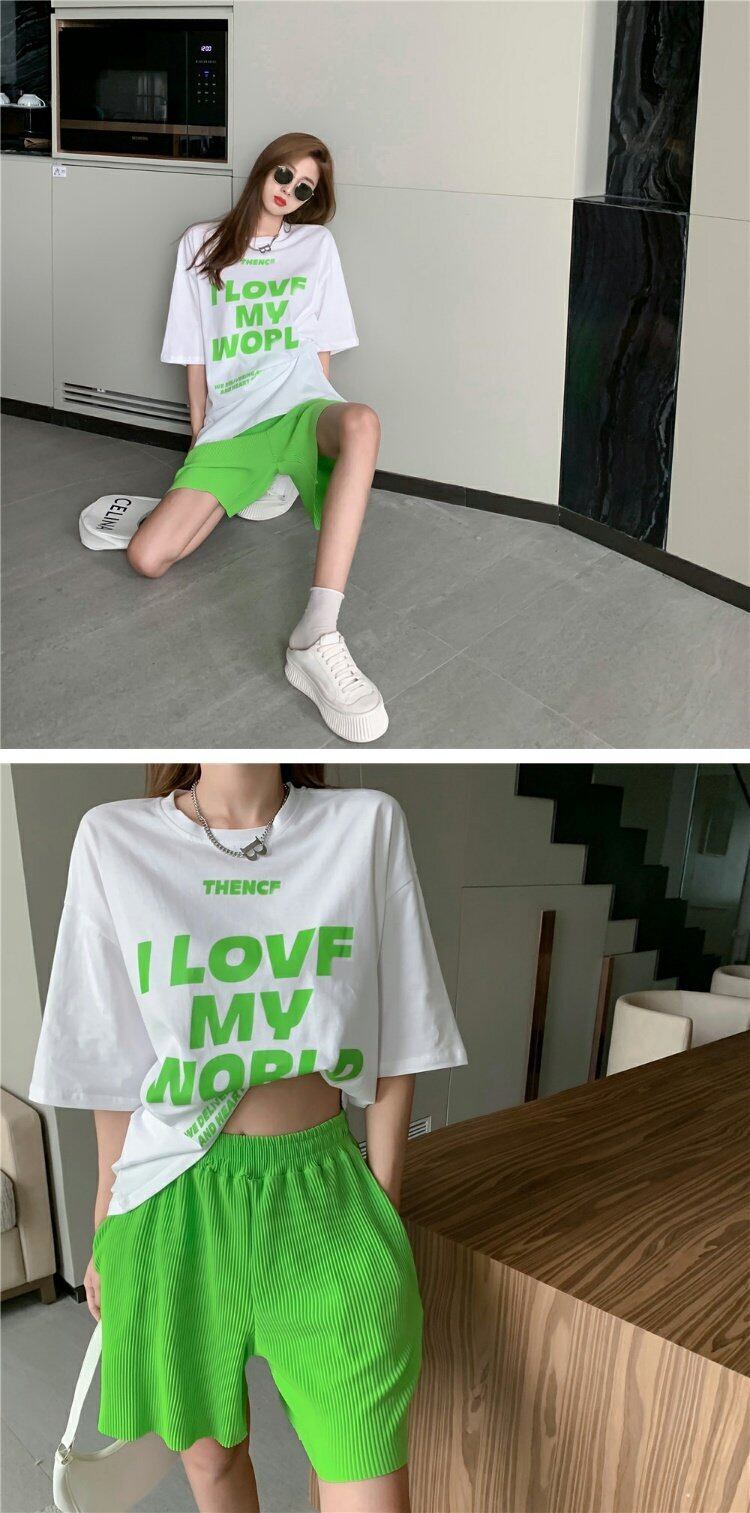 色:イエロープリントTシャツ,グリーンプリントTシャツ,黄色のショートパンツ,グリーンショートパンツ