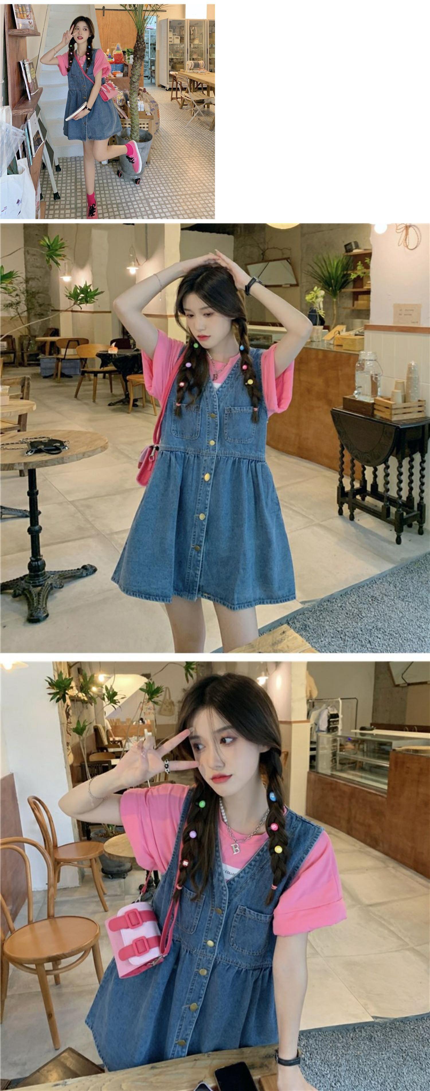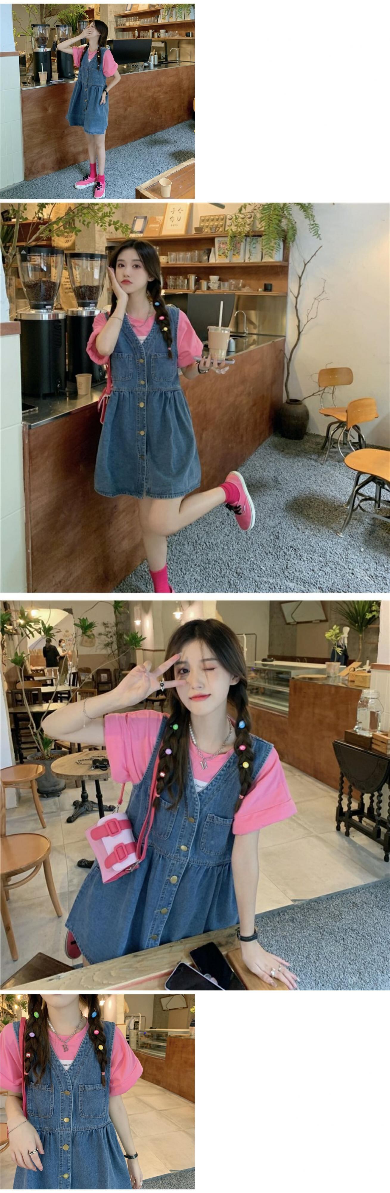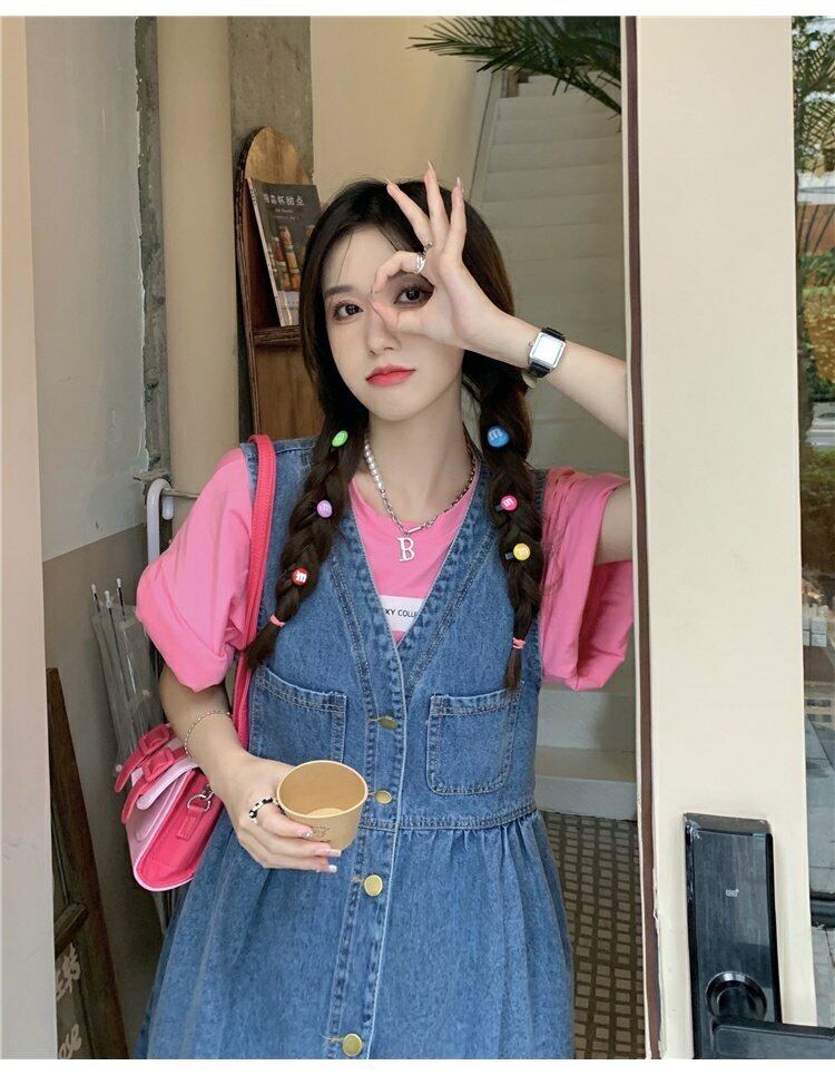 色:ピンクのTシャツ,デニムストラップドレス
