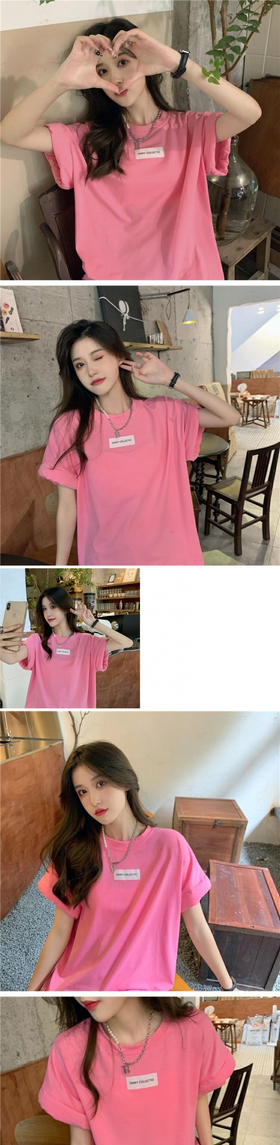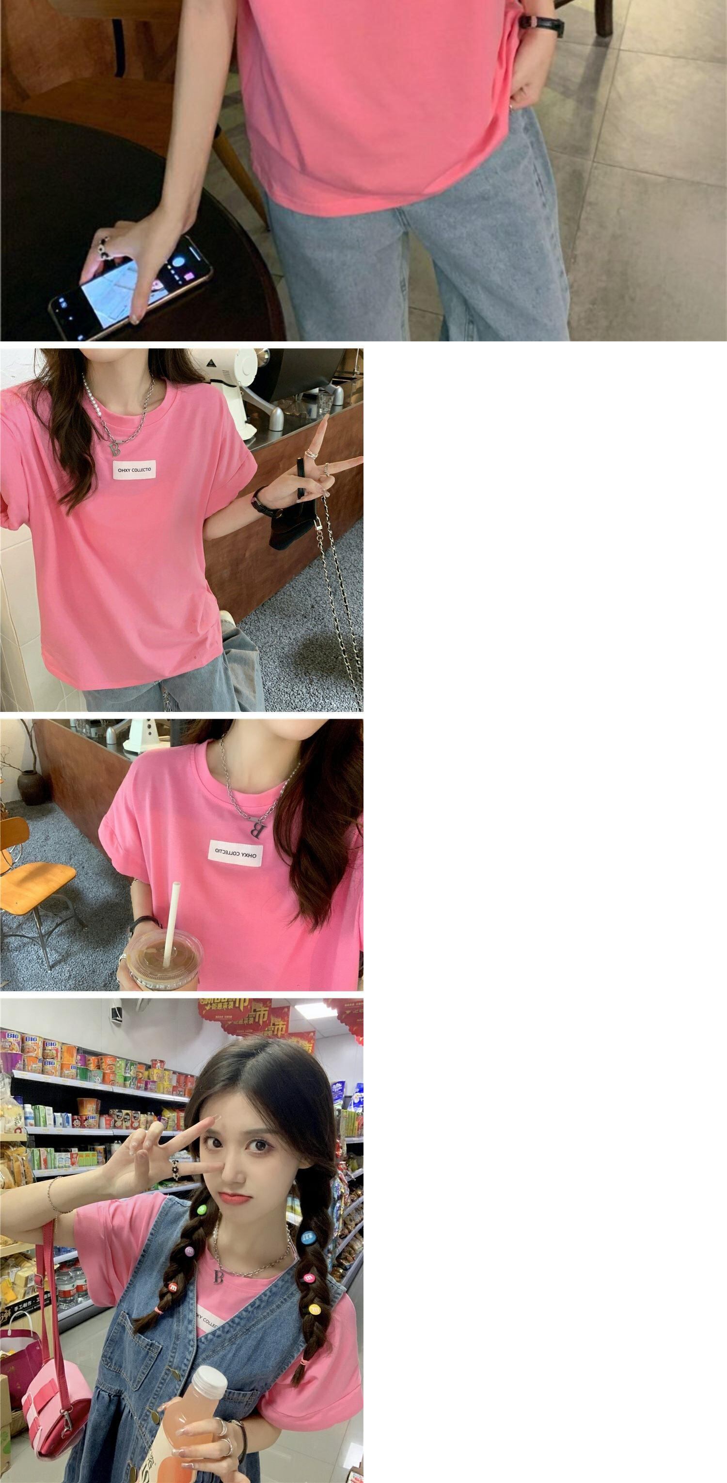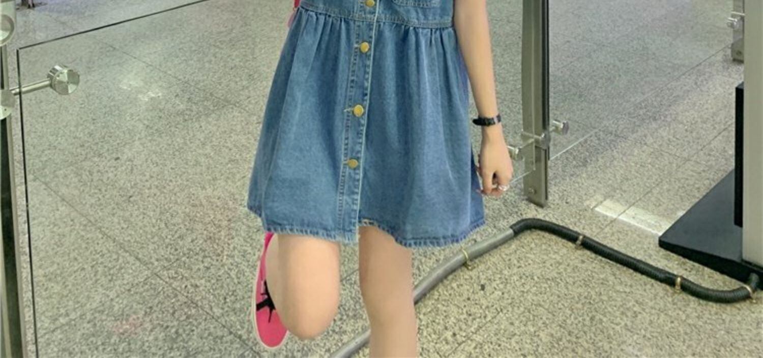 色:ピンクのTシャツ,デニムストラップドレス