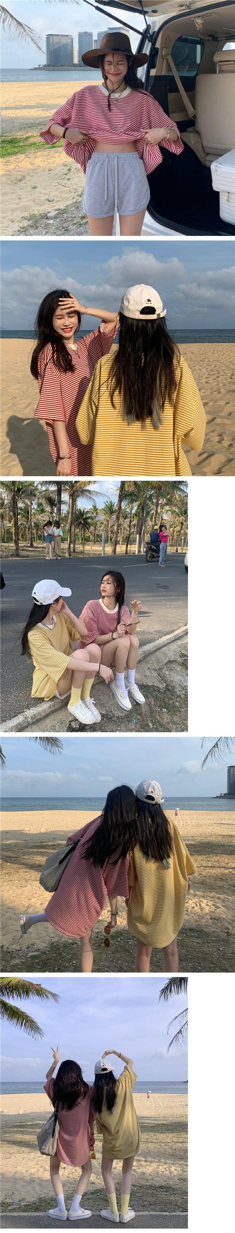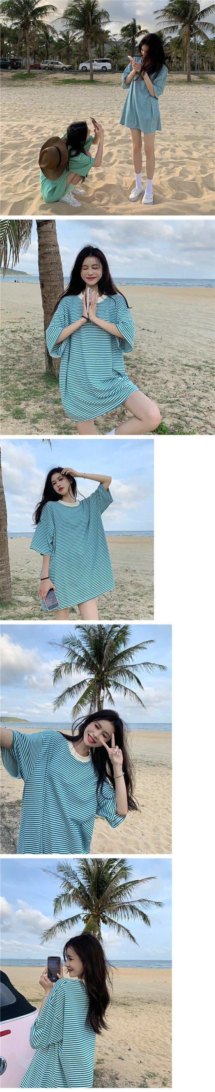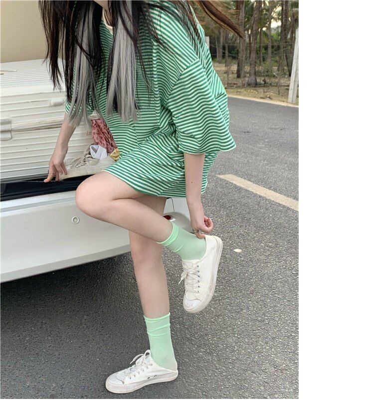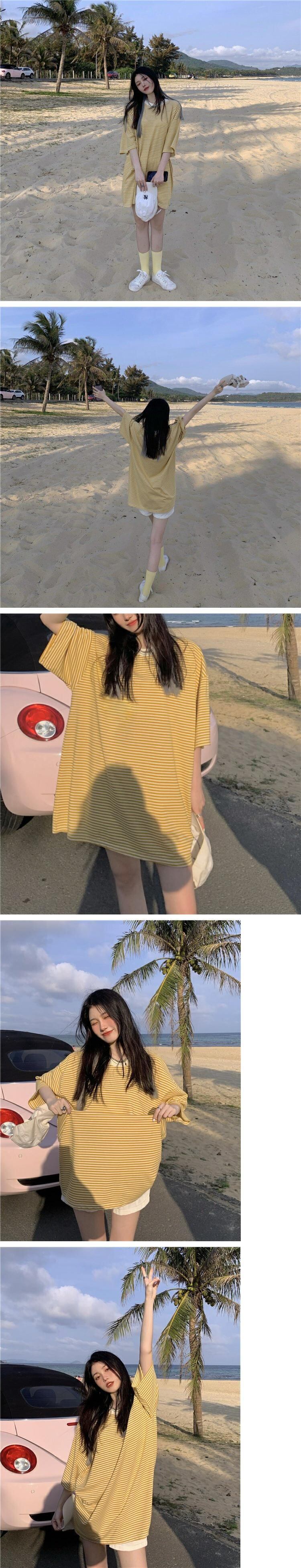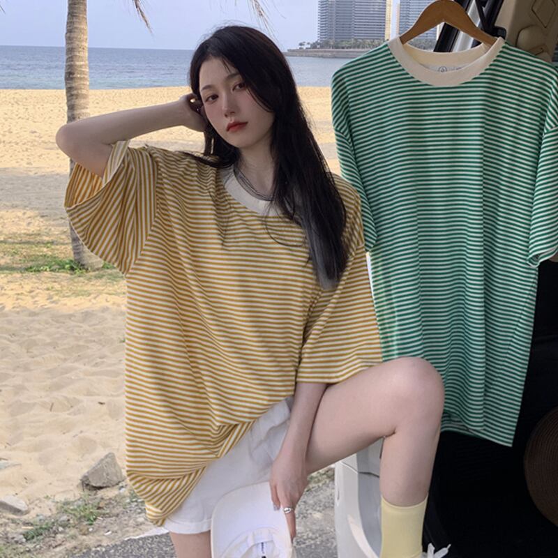 ストライプTシャツレディース夏服韓国ファッションルーズスタイルトップス 夏物 ミドル丈 コーデ marchs6749389037265