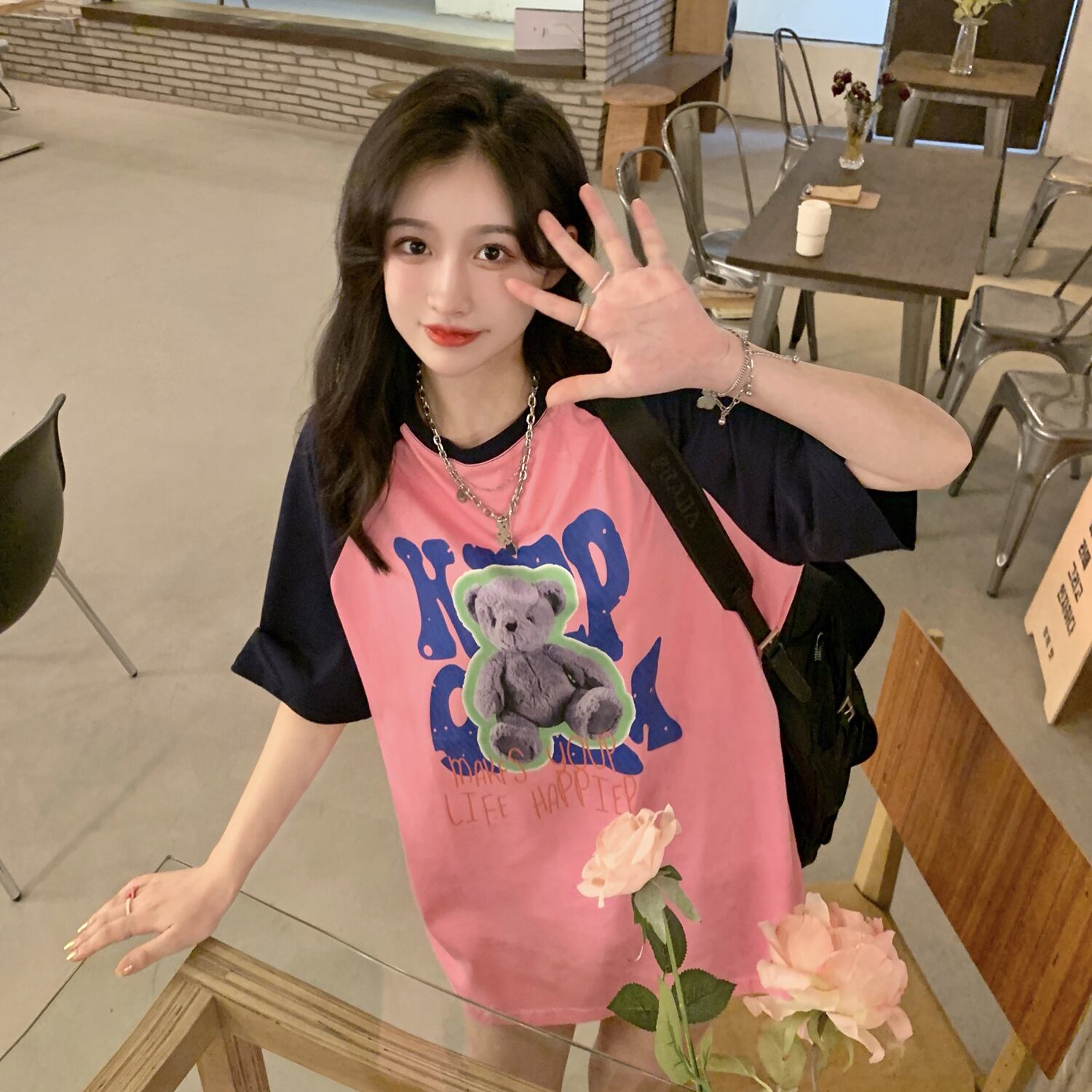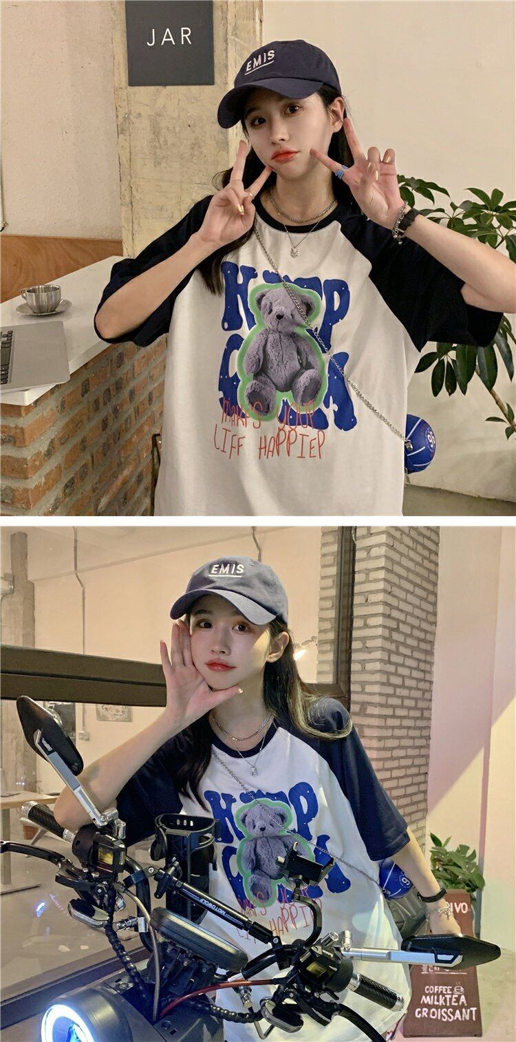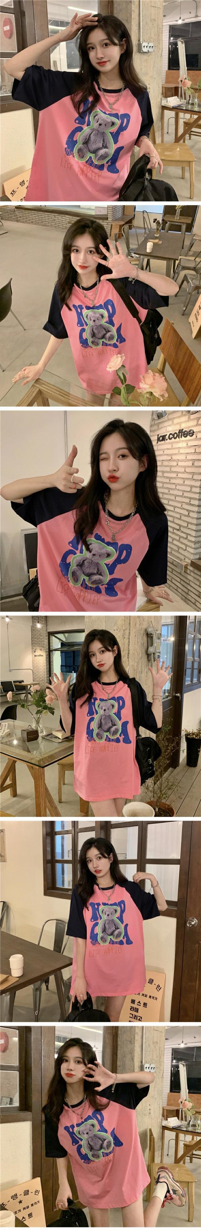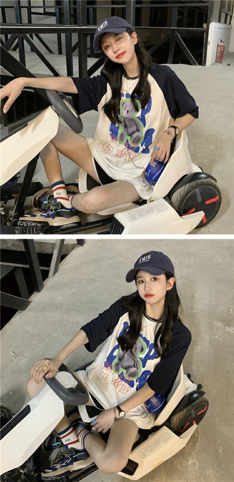 夏服韓国ファッション薄手プリント柄スリーブルーズトップス 半袖Tシャツレディース ショート ハーフスリーブ 夏物 ステッチ スタイル コーデ marchs6777197178501