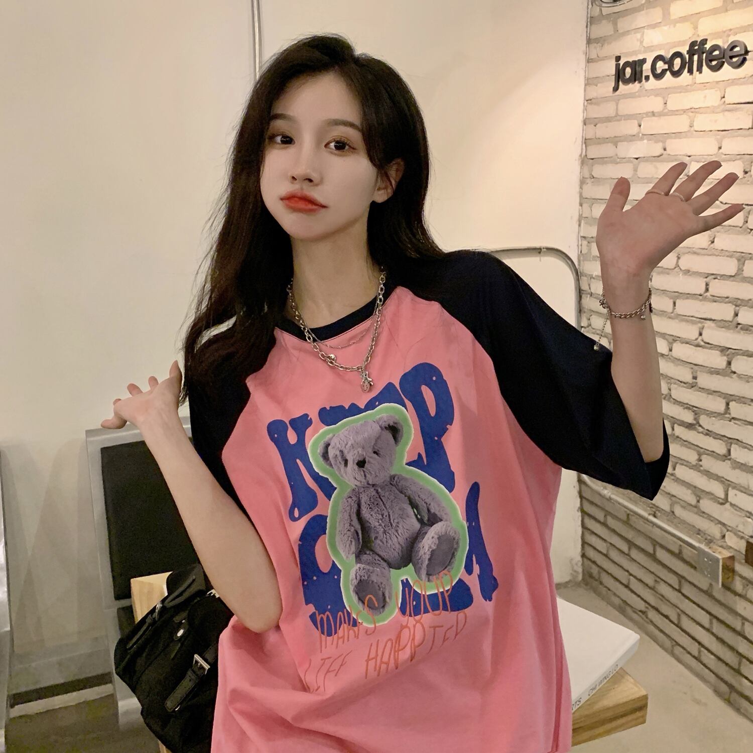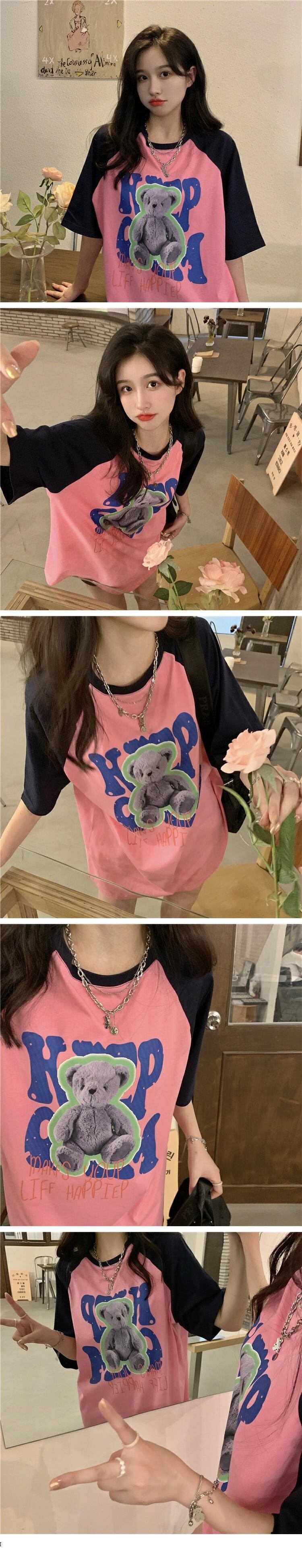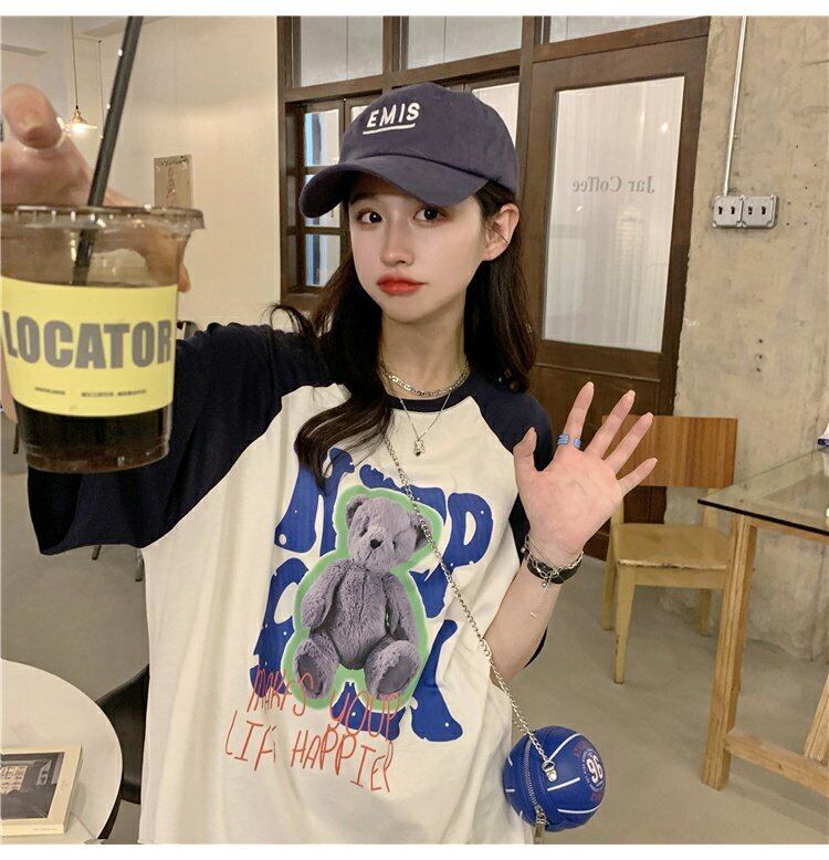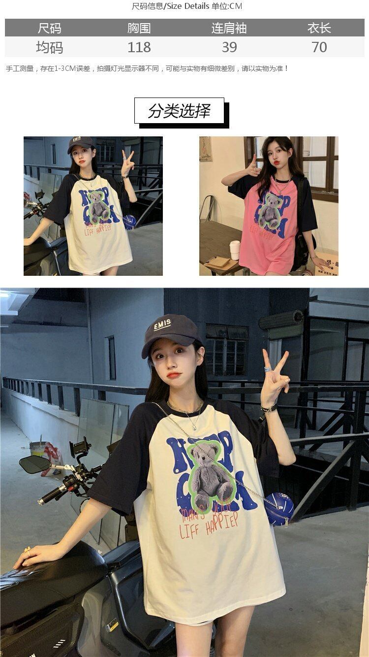 夏服韓国ファッション薄手プリント柄スリーブルーズトップス 半袖Tシャツレディース ショート ハーフスリーブ 夏物 ステッチ スタイル コーデ marchs6777197178501