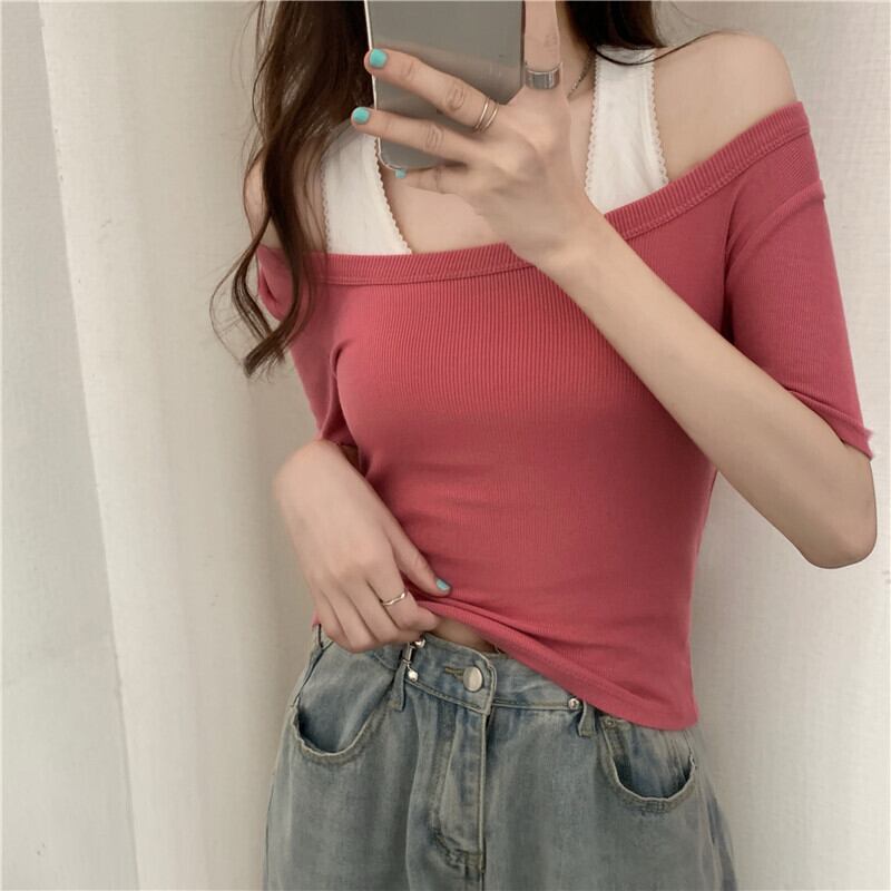 Tシャツ夏服カラースリム半袖スリーブトップス ショート ハーフスリーブ 大人ガーリー スウィート キュート カジュアル 夏物 コーデ marchs6729904339313
