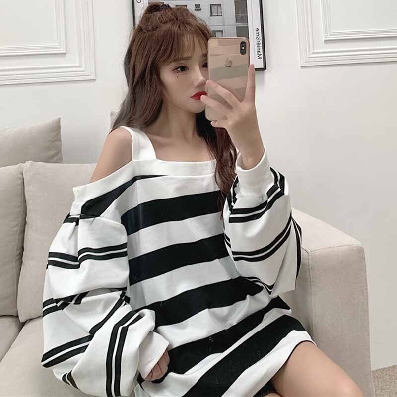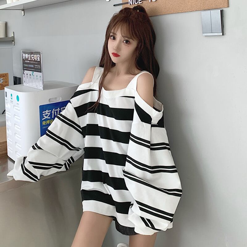 トップス スプリング秋物NEWストライプセーター ロング 春物 オータム オフショルダー 長袖 コーデ marchs6791381756443