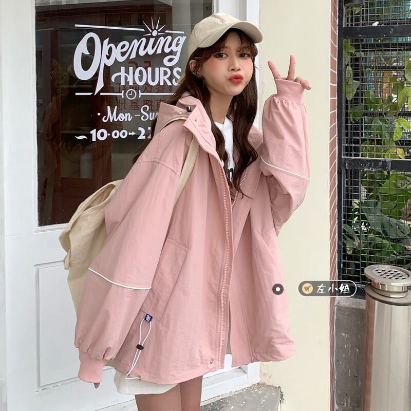 スプリング秋物ジッパーフードトップス ルーズ薄手ジャケット NEW ロング ピンク 春物 オータム 長袖 コーデ marchs6760351307048