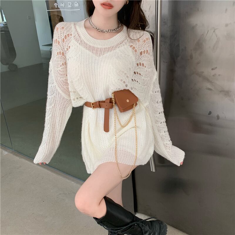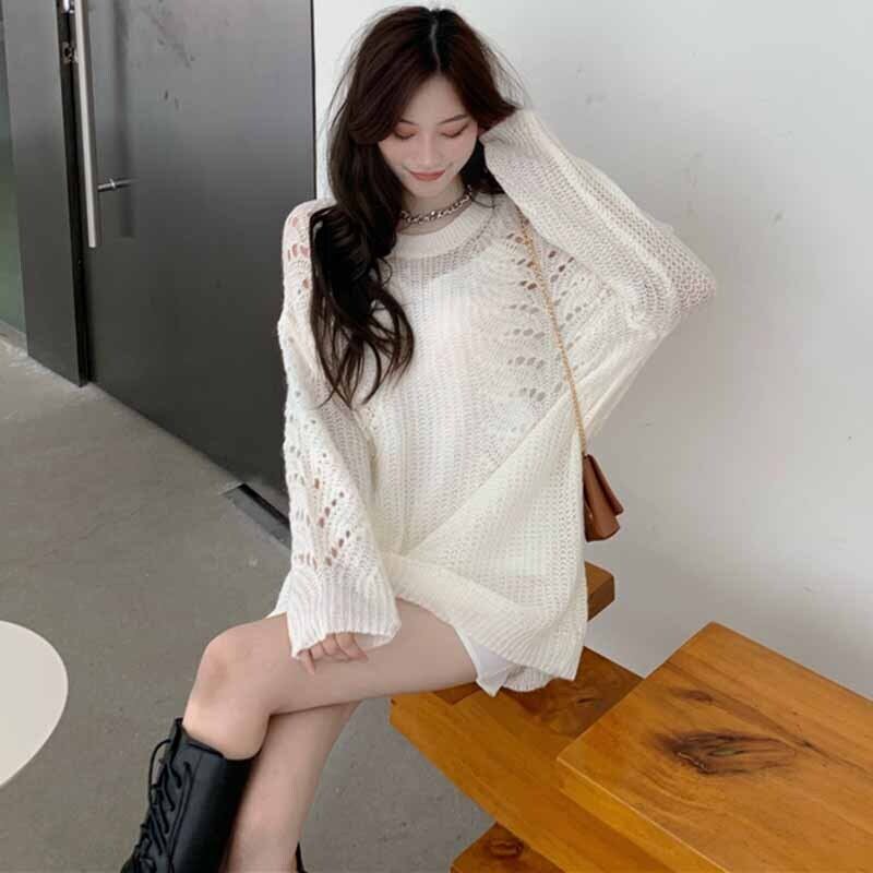 ルーズホワイト薄手セーター スプリング秋物ニットトップス 春物 オータム ミドル丈 コーデ marchs6764335253417