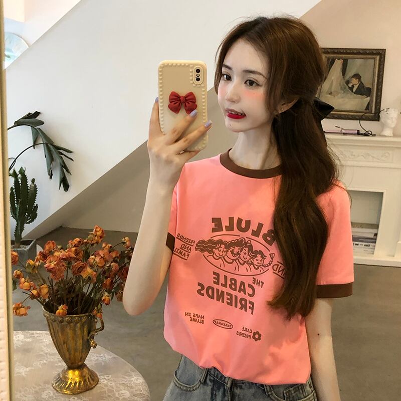 ヴィンテージTシャツレディース夏服韓国ファッションルーズカラーラウンドネックトップス 夏物 Oネック ビンテージ スタイル コーデ marchs6711495522976