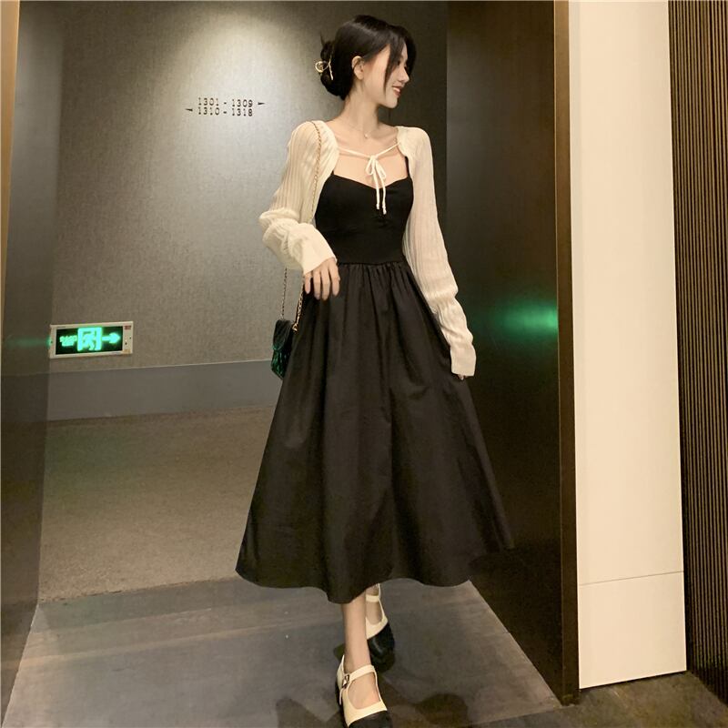 色:ベージュカーディガン,ブラックサスペンダースカート