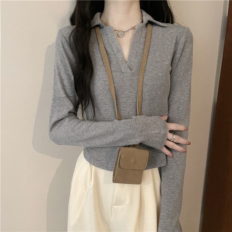 カラーVネックホワイトTシャツシャツ スプリング秋物クロップドトップス ゆったり ロング 春物 オータム 長袖 コーデ marchs6731956549737