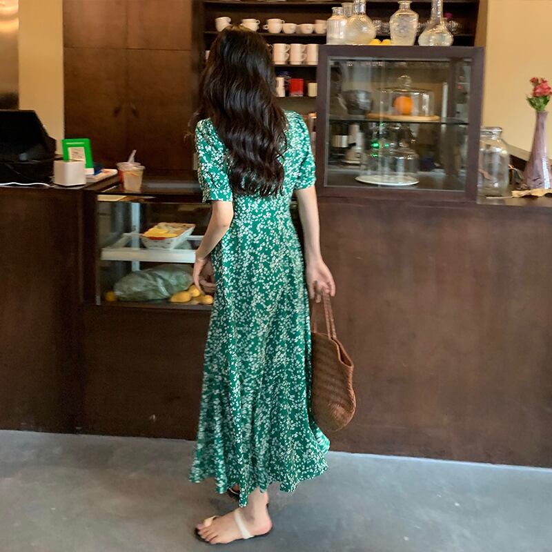 夏服ハイウェストウェストグリーンVネックワンピースレディースロングスカート 夏物 ウエスト コーデ marchs6776510980127