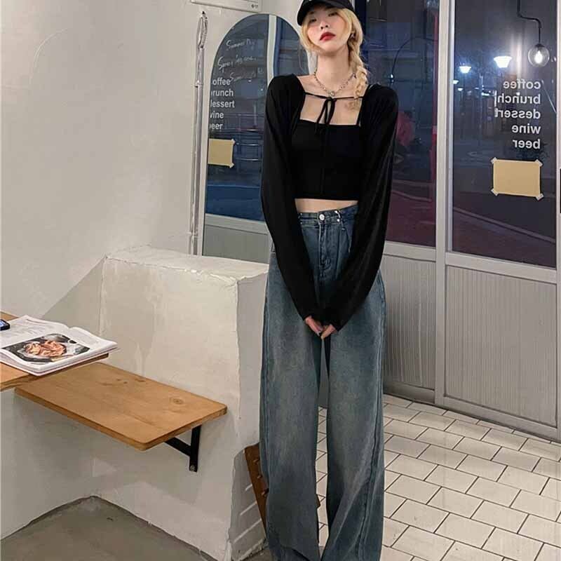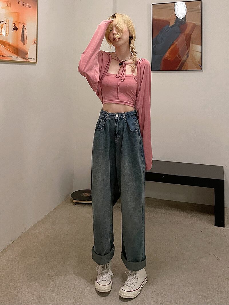韓国ファッションスタンダードジーンズ スプリング秋物NEWハイウェストウェスト薄手ルーズワイドレッグパンツ レトロ ストリート 春物 オータム ワイドパンツ スタイル ウエスト コーデ marchs6775775620829