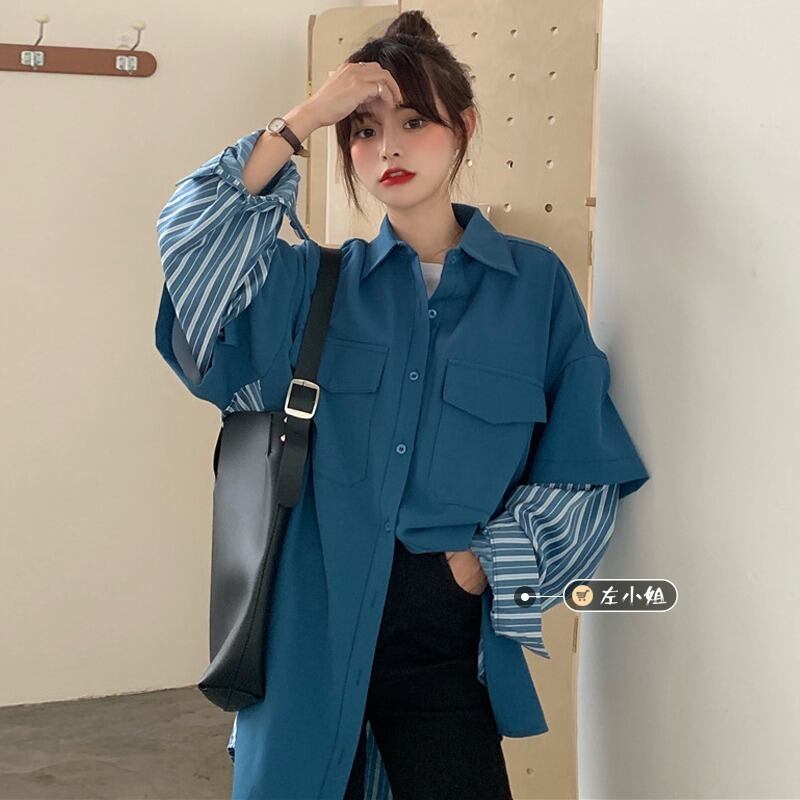 ブルーシャツ スプリング秋物ストライプシャツ ロング 春物 オータム ステッチ 長袖 コーデ marchs6750079681664