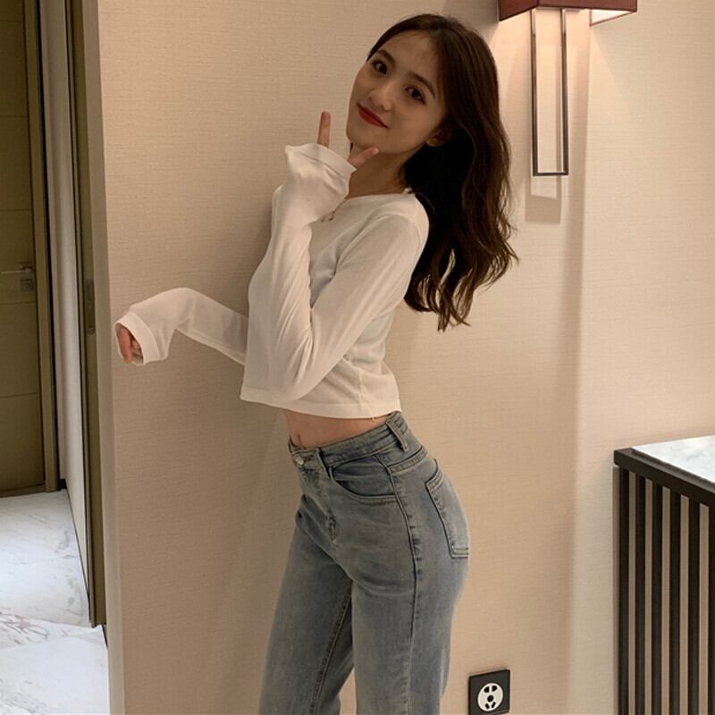 スプリング秋物韓国ファッションカラーショートクロップドハイウェストウェストゆったりトップス スリムTシャツレディース ロング 春物 オータム ピュア スタイル 長袖 ウエスト コーデ marchs6783565832009