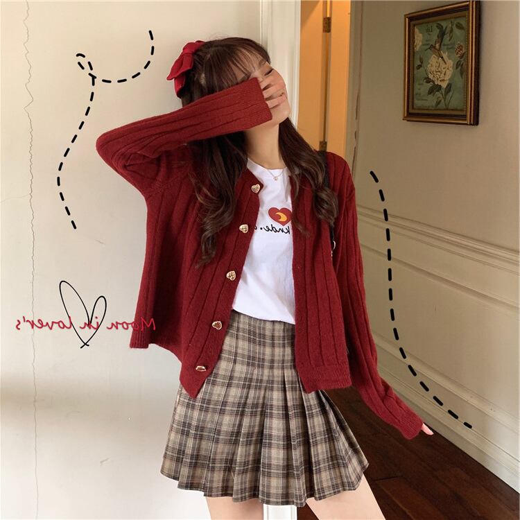 レッドニットカーディガンショートスプリング秋物韓国ファッションルーズ薄手セーター コート 春物 オータム スタイル コーデ Marchs15485978287