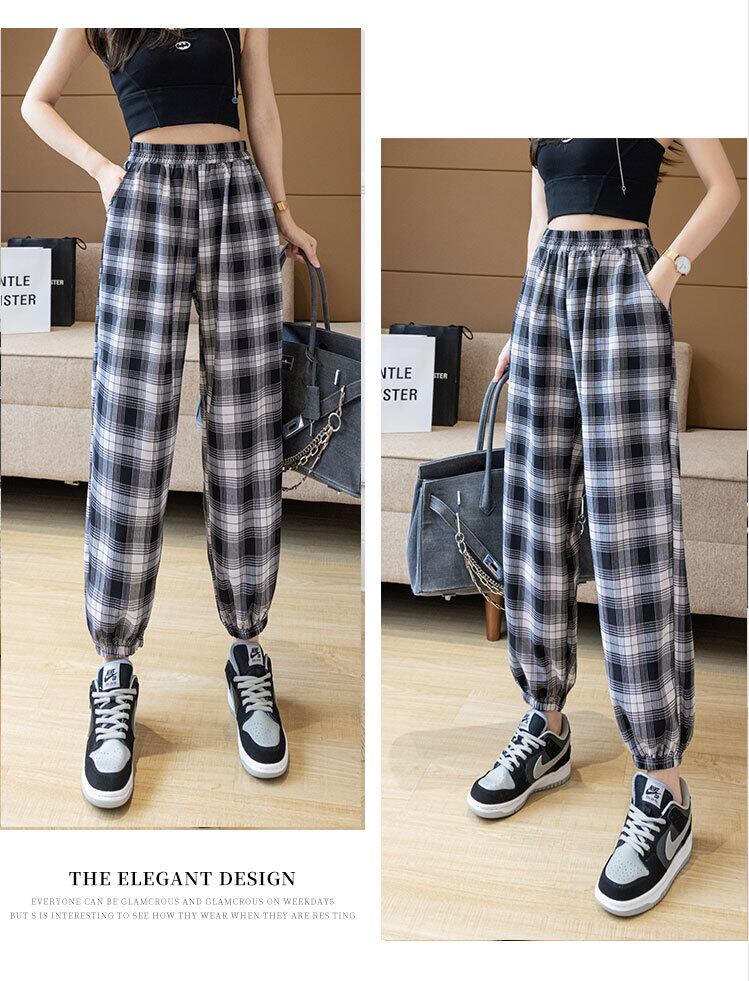 格子柄クロップド薄手夏服パンツ ハイウェストウェストルーズカジュアル 夏物 ウエスト コーデ Marchs85125646109