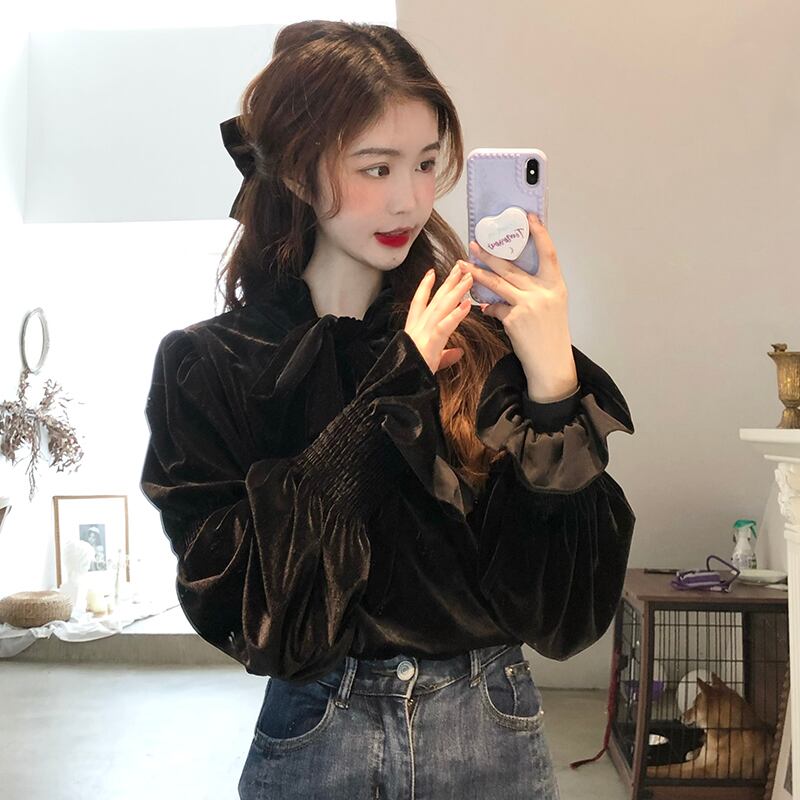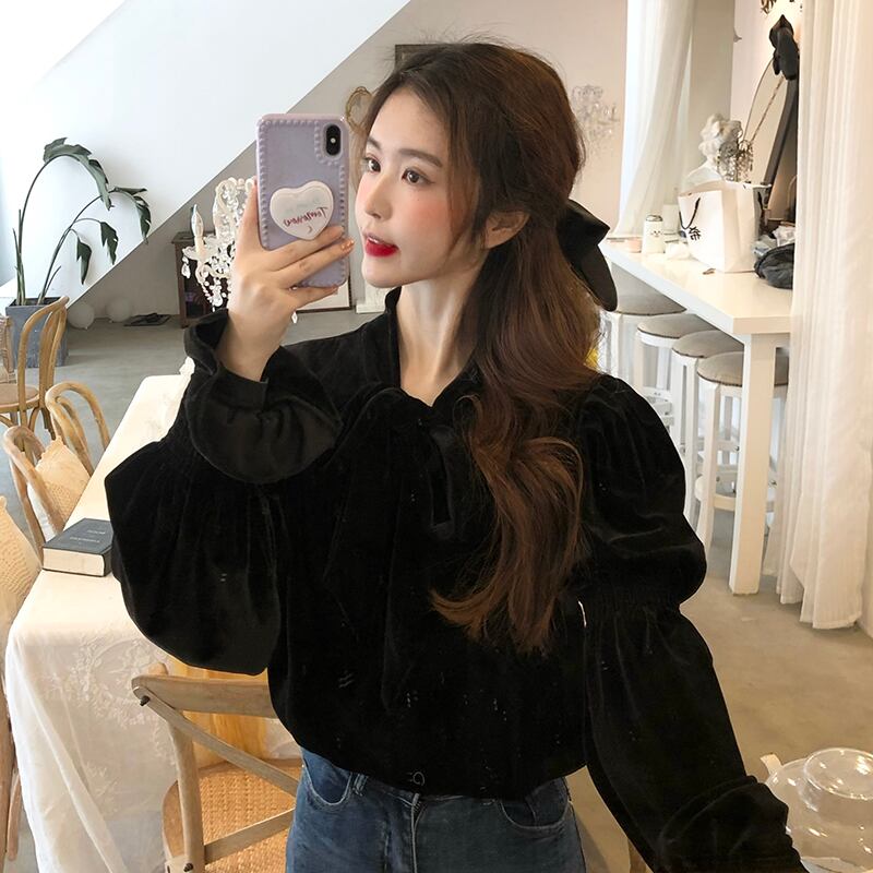 ブラックゴールド厚みスリーブシャツ レディーススタンダードブラウス 秋物 ロング リボン レトロ オータム 長袖 コーデ Marchs44711809981