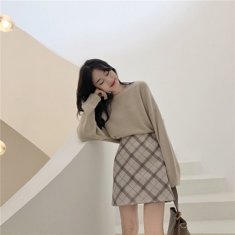 秋物スタンダードカーキ格子柄スカート ウィンターセーター ハイウェストウェストAライン レトロ オータム 冬物 ウエスト コーデ Marchs89128723789