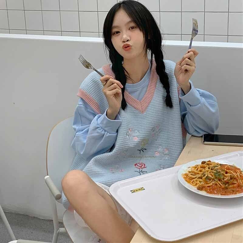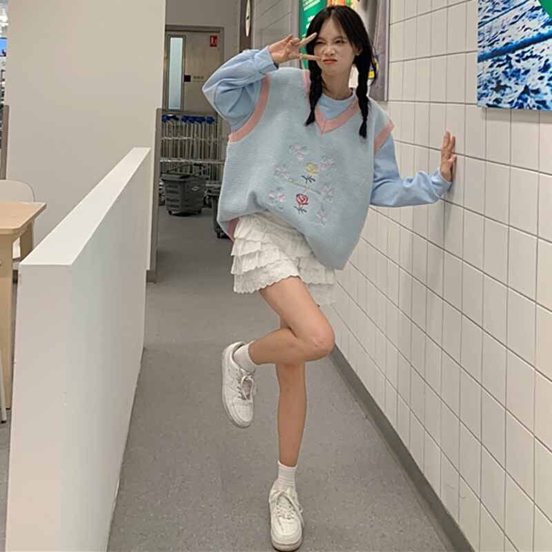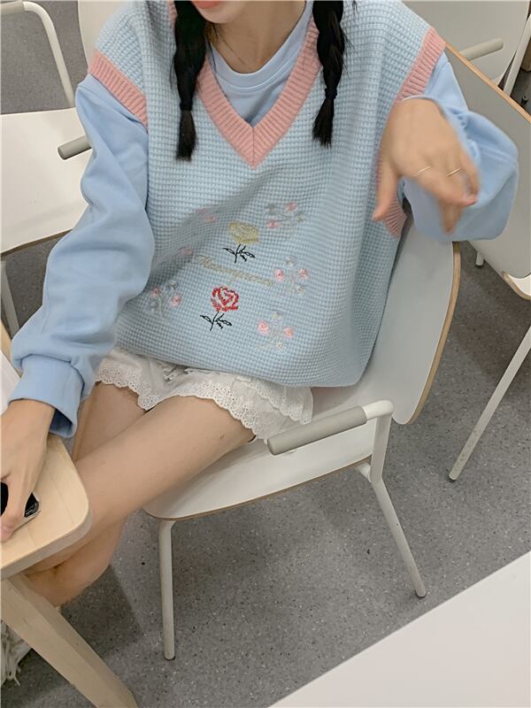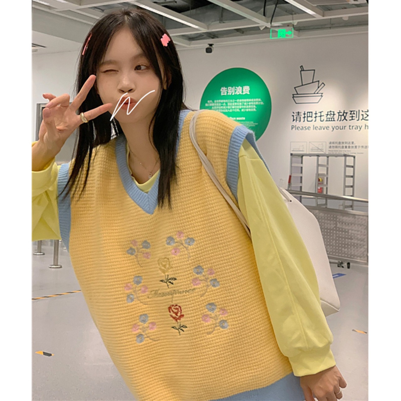 色:黄色のベスト,青いベスト,水色のセーター,薄黄色のセーター