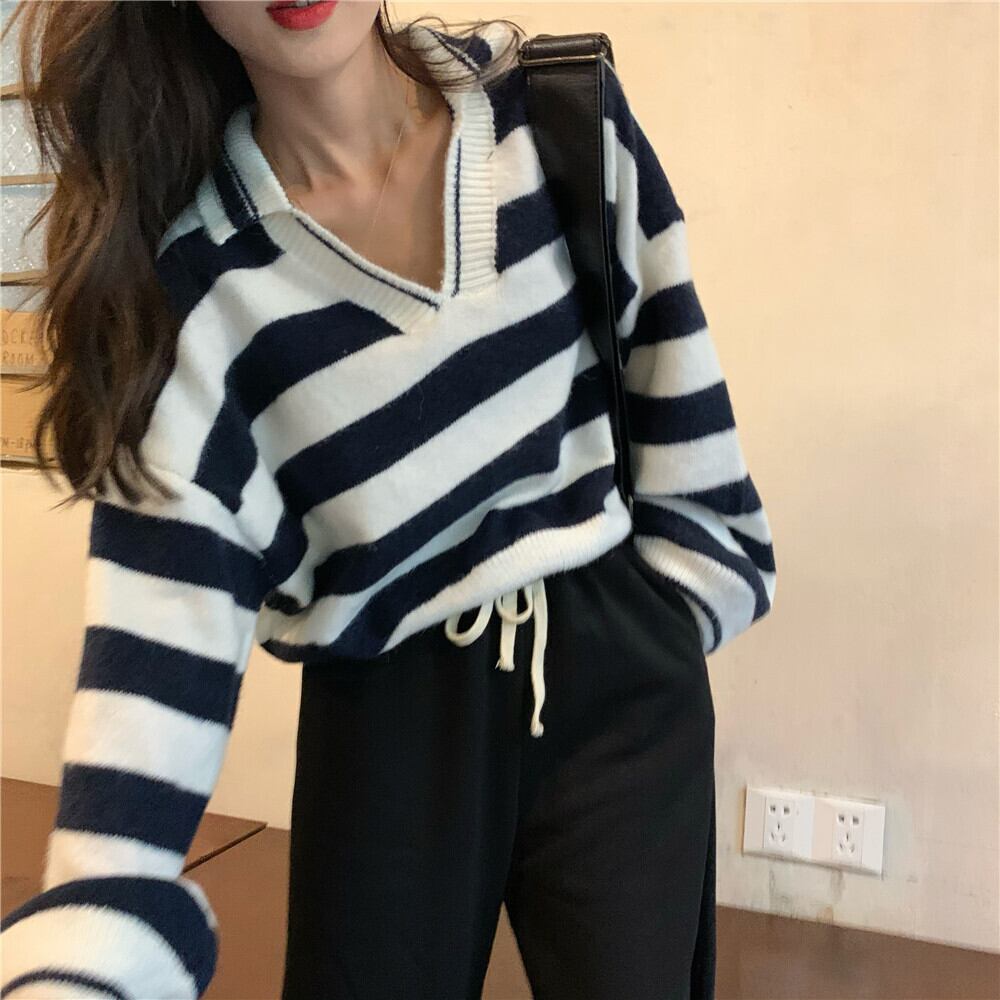 韓国ファッションルーズストライプVネックセーター スプリング秋物クロップトップ トップス ロング 春物 オータム スタイル 長袖 コーデ marchs6764357909349