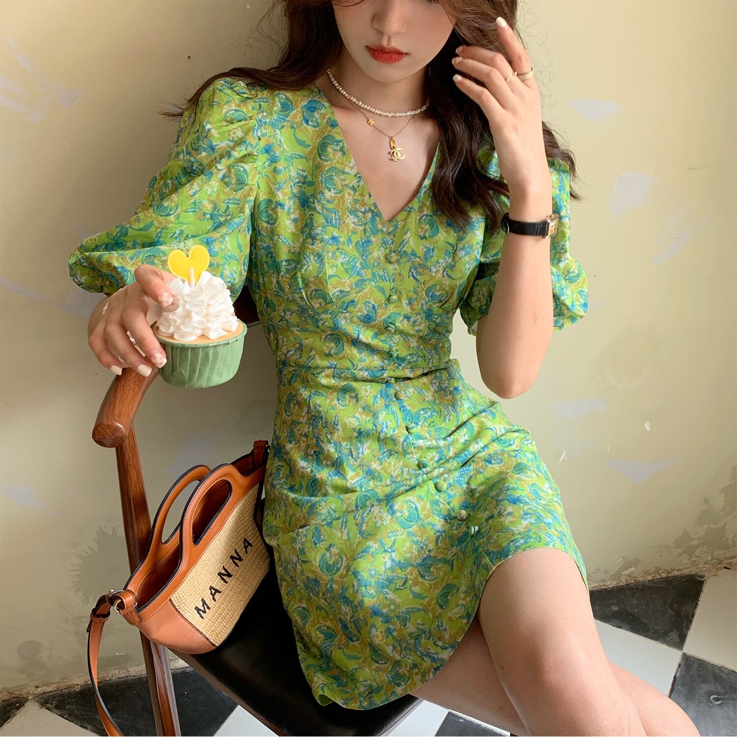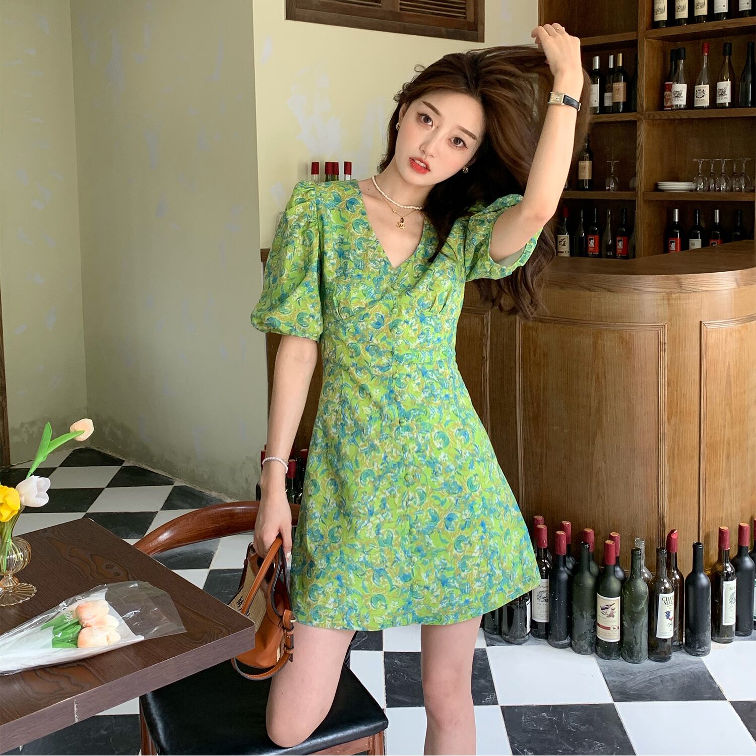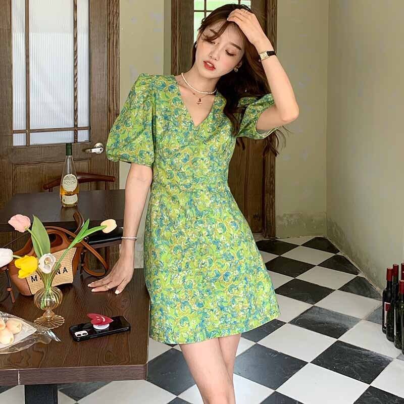 ワンピースレディース夏服パフスリーブスリーブVネックフローラルグリーンショートスカート 夏物 花柄 コーデ marchs6721530646325