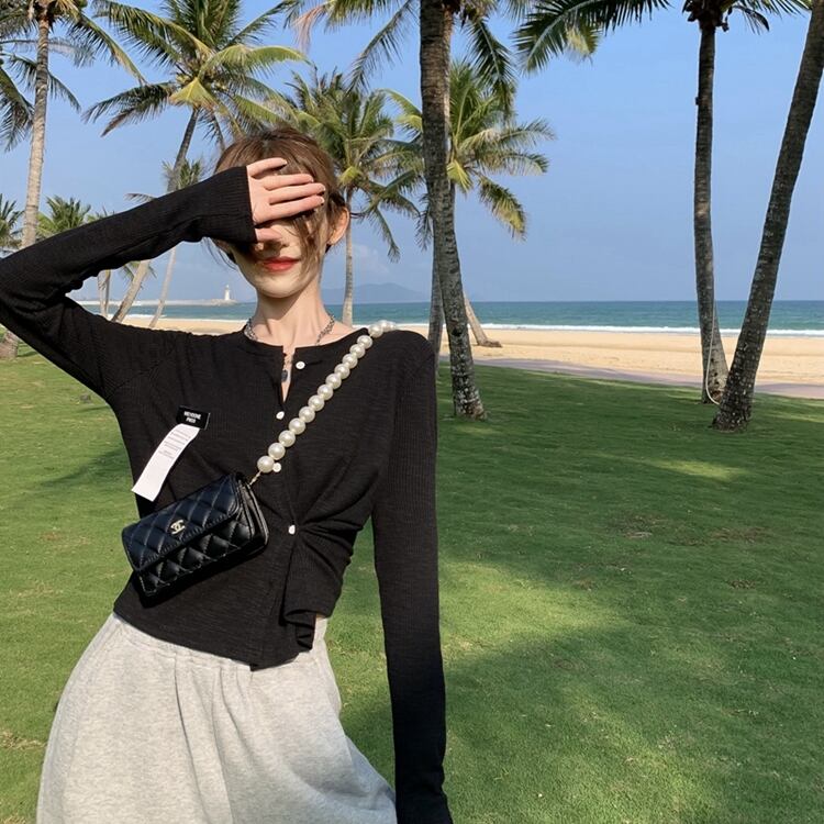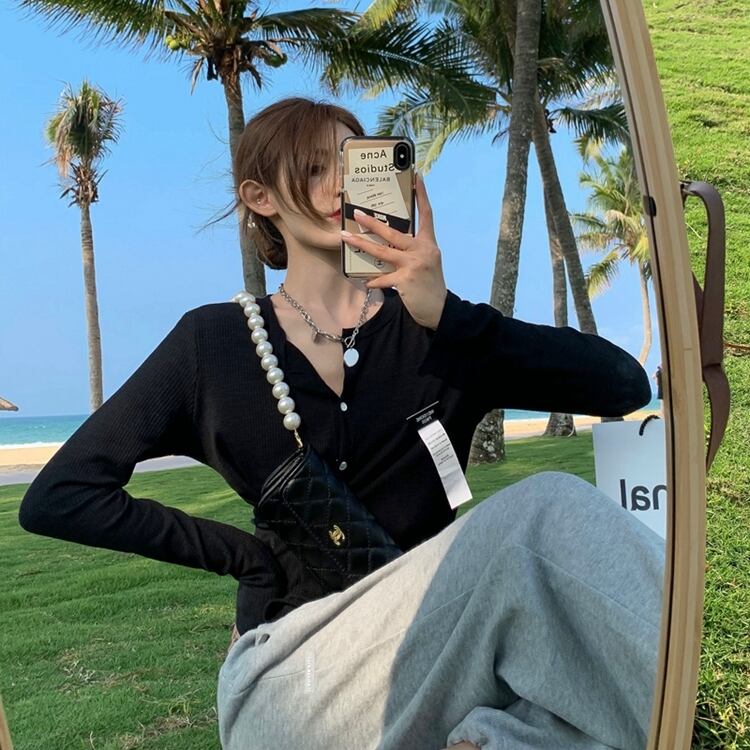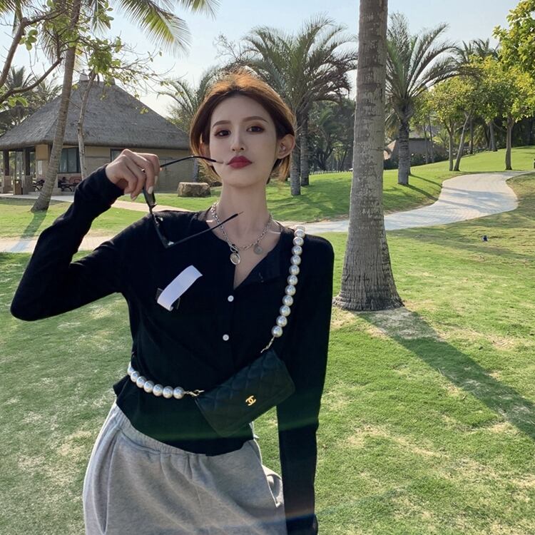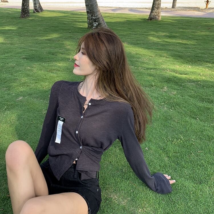 ブラック薄手ニットセーター カーディガンジャケット 夏服クロップドトップス ブラウス 夏物 コーデ Marchs52879912408