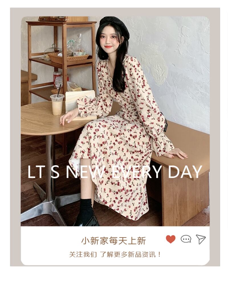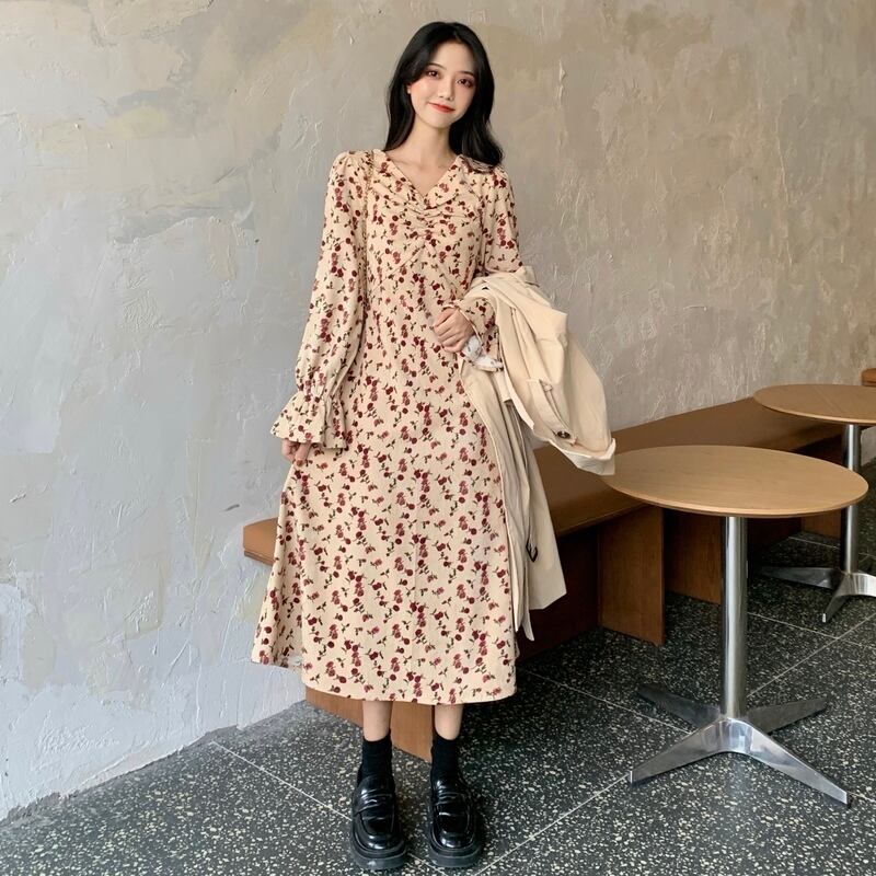 フローラルワンピース秋物スリムVネックシフォンロングスカート オータム 花柄 コーデ Marchs21650067553