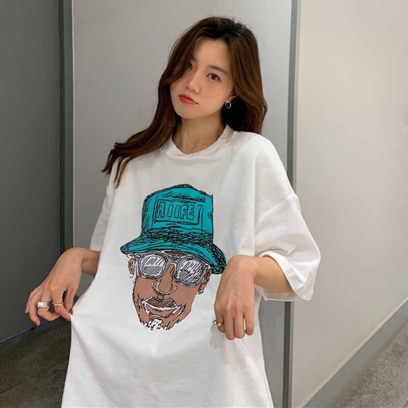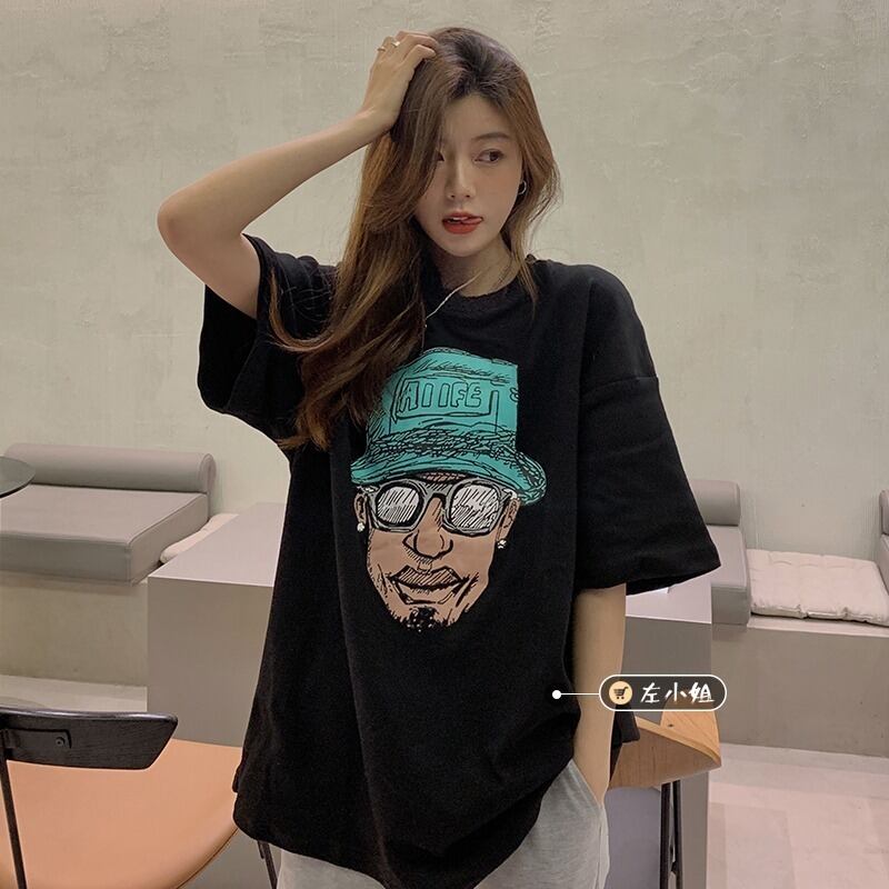 ルーズTシャツレディース夏服スタンダードプリント柄トップス ブラック レトロ 夏物 コーデ marchs6732337317536